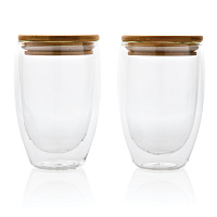 Набор стаканов из боросиликатного стекла с двойными стенками и бамбуковой крышкой, 350 мл