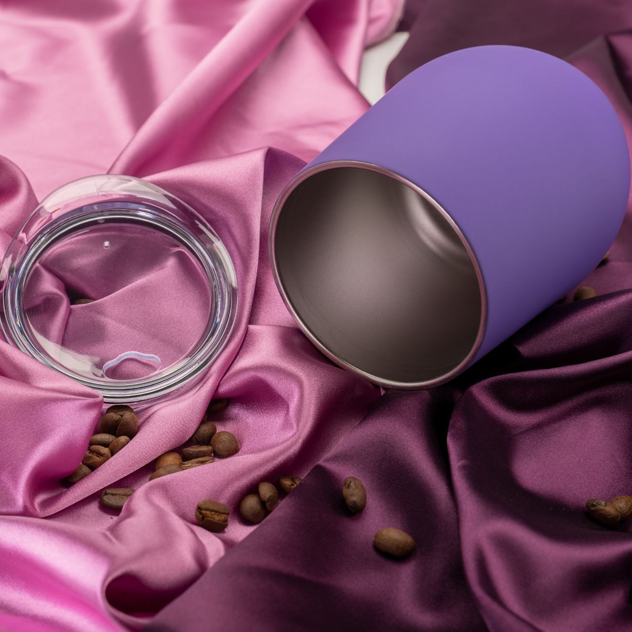 Кофер с тактильно приятным покрытием софт-тач имеет двойные стенки из нержавеющей стали и пластиковую крышку с эргономичным отверстием.