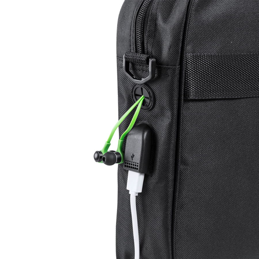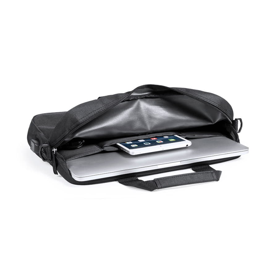 Сумка для документов из прочного полиэстера 600D с черным покрытием и застежкой-молнией. С выходом для наушников и внутренним отсеком с USB-портом для подключения powerbank (не входит в комплект). С прочными усиленными ручками и регулируемым ремнем. Внутри есть отделение с мягкой подкладкой для ноутбуков до 15 дюймов и отделение для планшетов до 10 дюймов. -