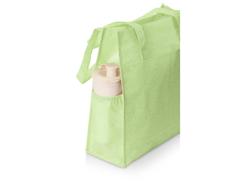 Легкая практичная и удобная сумка изготовлена из нетканого материала - 100% переработанного полипропилена. Благодаря широкому дну сумка обладает увеличенной вместительностью. Снаружи большой карман для мелочей. Сбоку с карман для бутылки. -