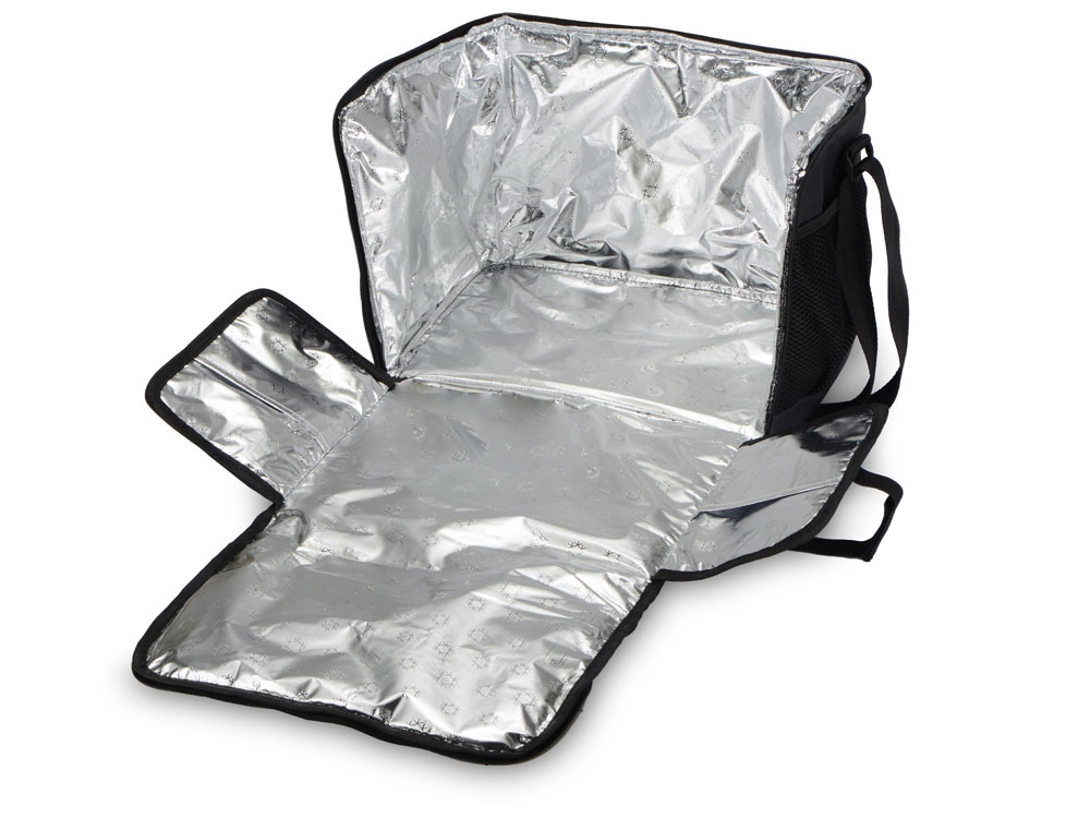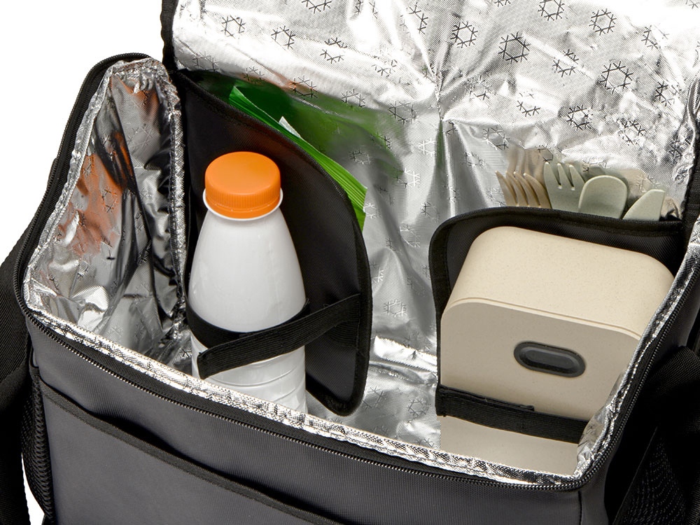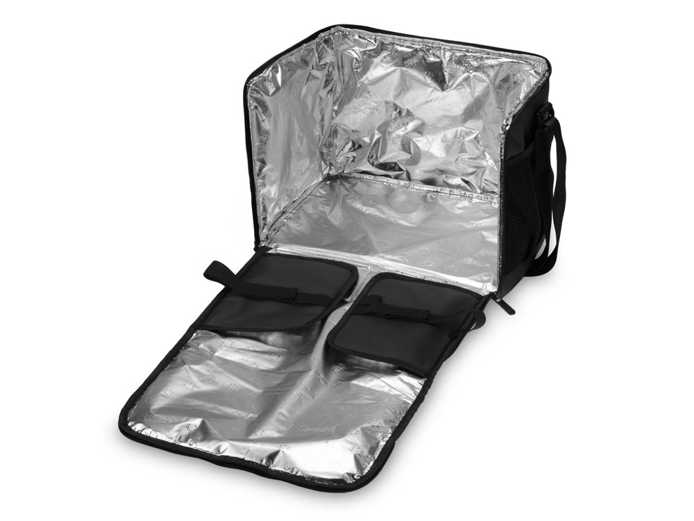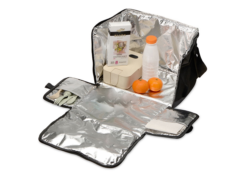 Раскладывается в удобное место для принятие пищи во время пикника на природе благодаря особой конструкции с молниями. Внутри карманы для всего необходимого и держатели на липучках для бутылок. Внутренняя подкладка из пены толщиной 3 мм. Широкая лямка регулируется по длине. 2 боковых сетчатых кармана. -