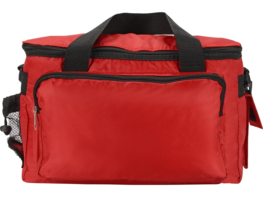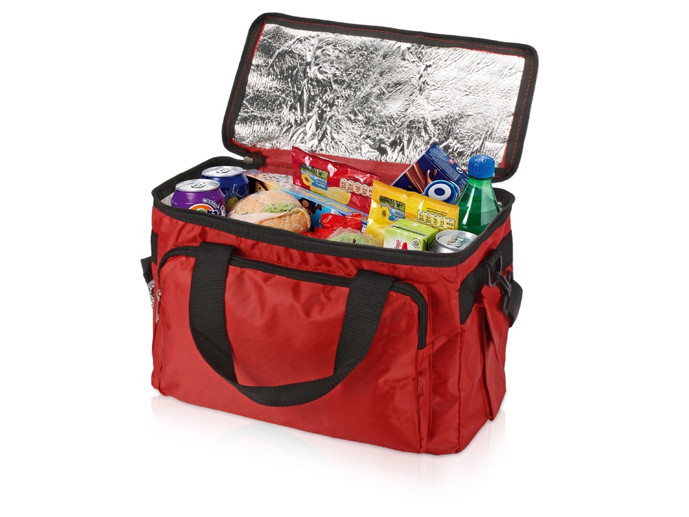 Вместительная сумка-холодильник (объем – 15 л.) Камайоре прекрасно подойдет не только для индивидуальных пикников, но даже и для доставки горячих продуктов (пиццы, например). С боков 2 кармана – один сетчатый с регулируемой затяжкой для бутылки. Другой для приборов, салфеток или других мелочей закрывается на липучку. Наружный слой сделан из полиэстера, на него может быть нанесена персонализация: имя владельца или логотип компании. -