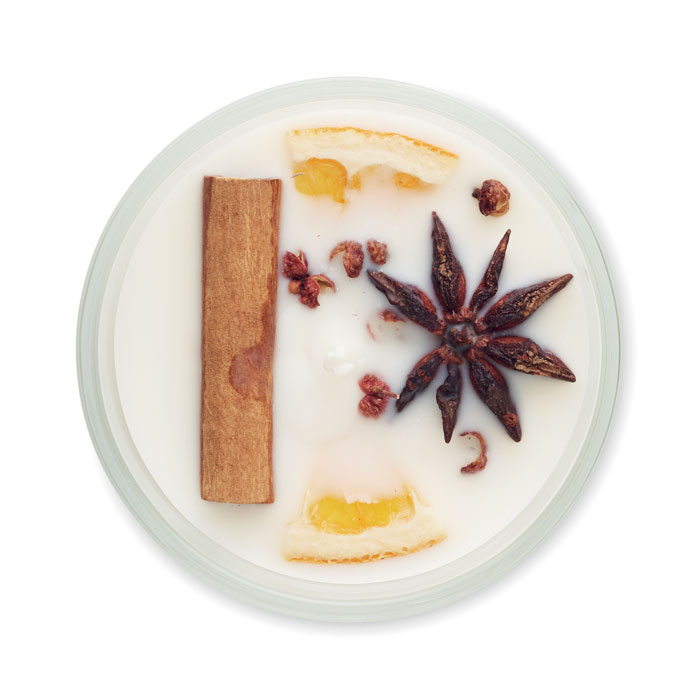 Небольшая восковая свеча на растительной основе с ароматом корицы и цитрусовых, с засушенными цветами и фруктами в стеклянном стаканчике. 85 гр. Время горения: 14 часов. -