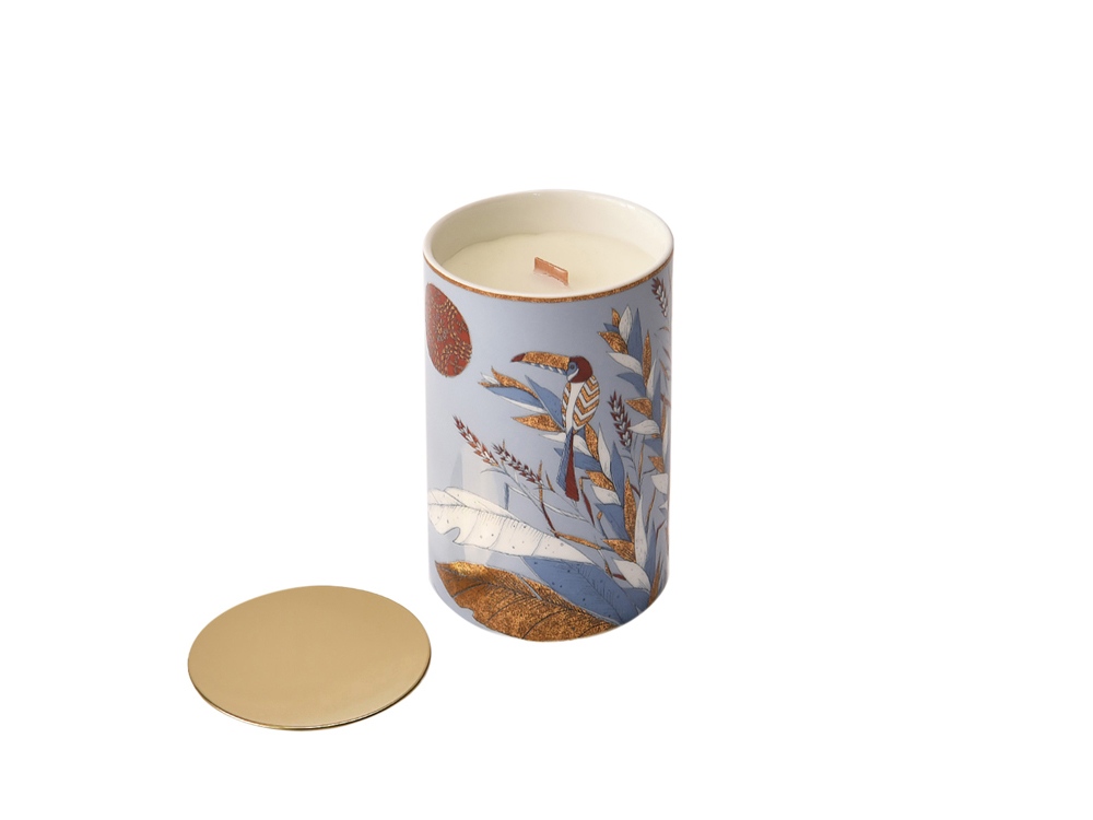 Китайский фарфор, соевый воск, деревянный фитиль, крышка- нержавеющая сталь с позолоченным покрытием, выполненное методом гальванизации