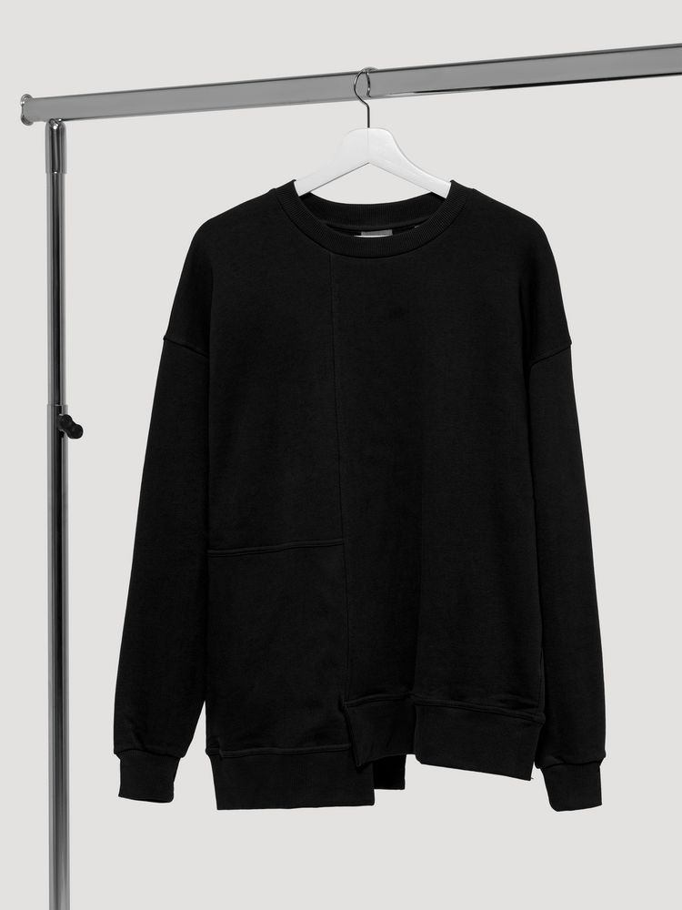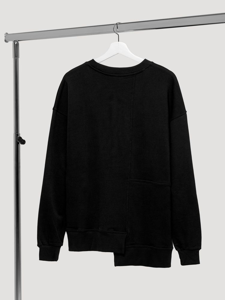 Свитшот унисекс свободного кроя со спущенным плечом и нестандартным нижним краем.