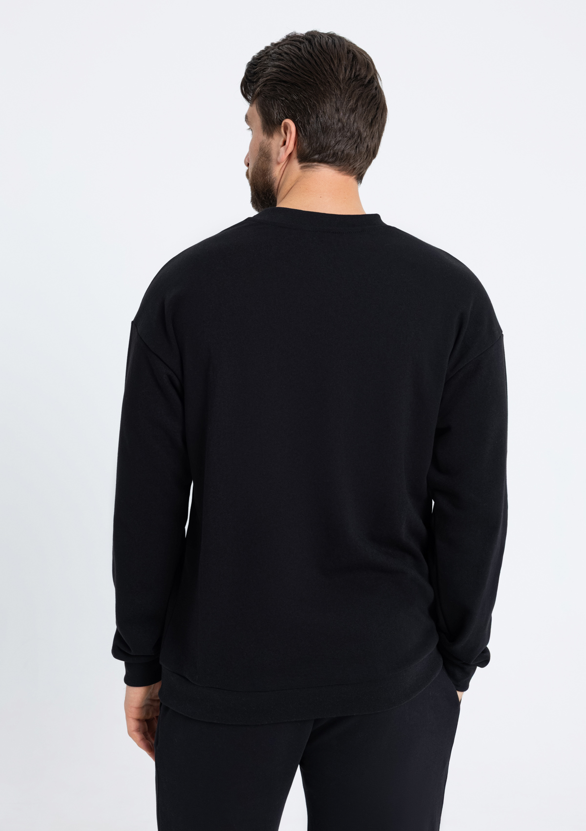 Свитшот расслабленного кроя с широкой горловиной, спущенной линией плеча и манжетами на рукавах по нижнему краю изделия.