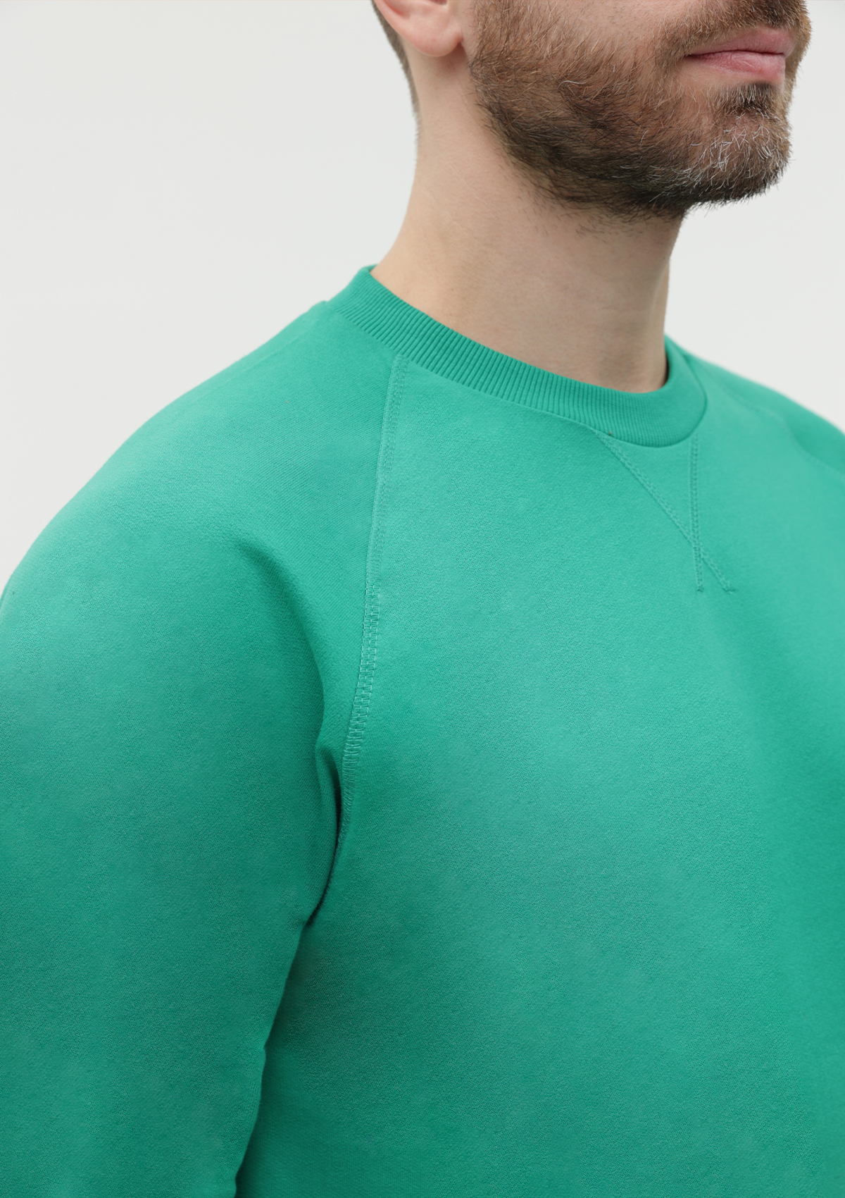 Свободный силуэт, округлый вырез, рукав-реглан и декоративные элементы, отсылающие к классическому крою. Ворот и манжет выполнены широкой эластичной резинкой.