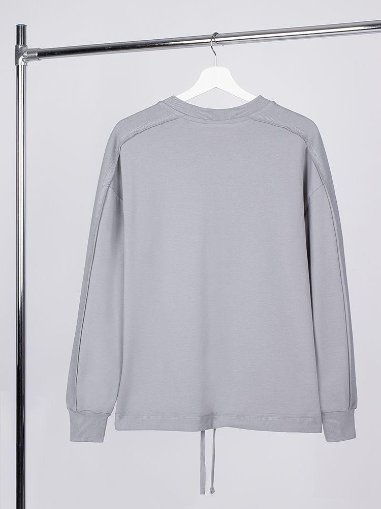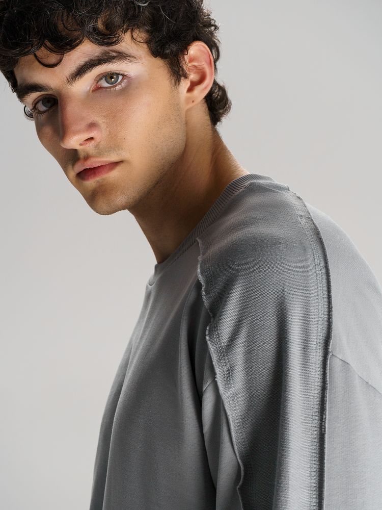 Свитшот унисекс оригинального пошива вдохнет новую жизнь в повседневный гардероб и добавит стильную нотку легкой небрежности в образ. Особая конструкция, где часть деталей — плечи и рукава — вывернута наизнанку, создает необычный притягательный эффект.