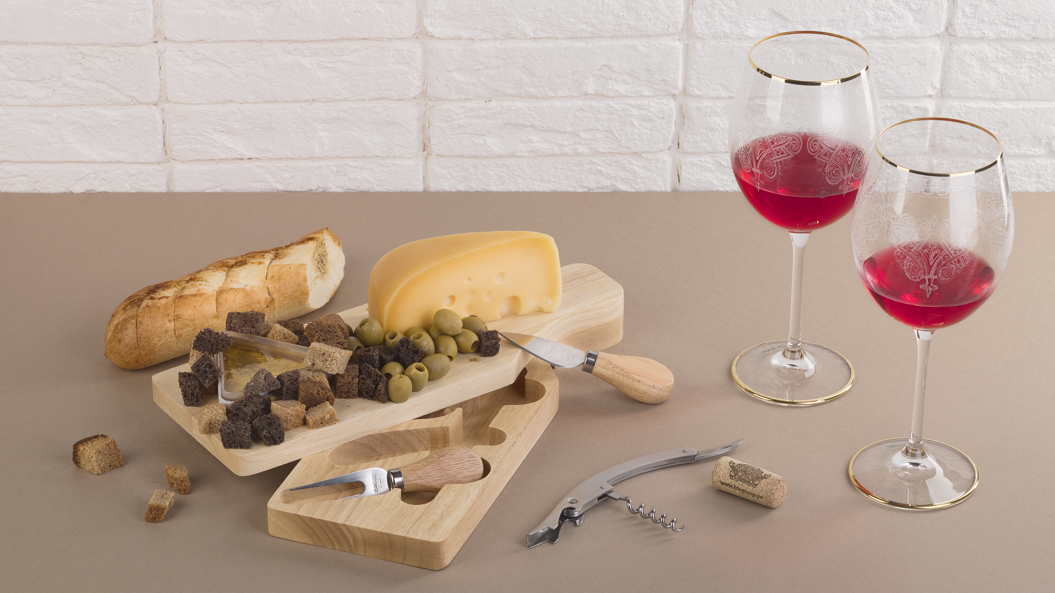 Набор для сыра и вина "Gourmet" сочетает в себе изящную сервировочную доску с отсеком хранения приборов для сыра.