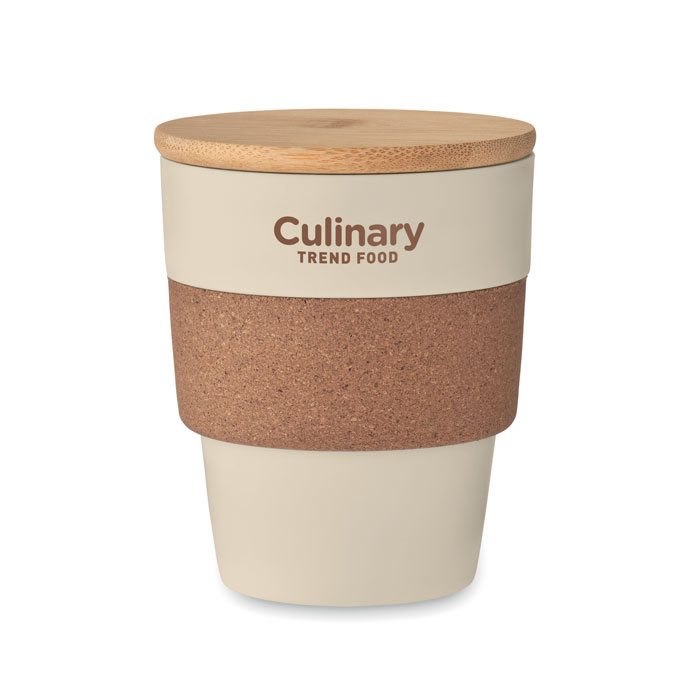 Одностенный стакан из переработанного полипропилена с пробковой защитной вставкой и бамбуковой крышкой. Объем: 300 мл. Возможна частичная теплопередача. -