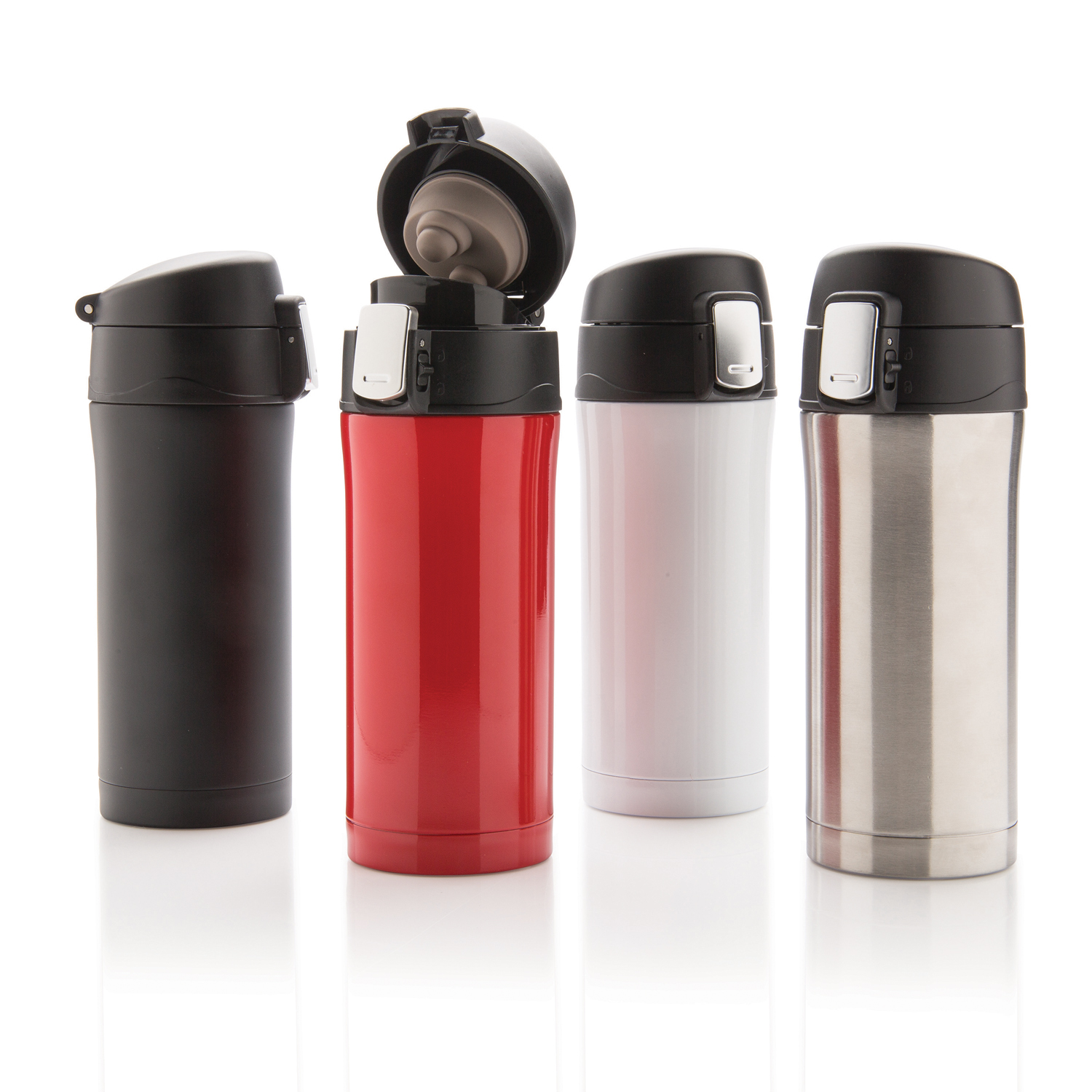 Термокружка Easy lock объемом 300 мл с двойными стенками из нержавеющей стали сохранит температуру горячего чая или кофе до 5 часов и холодного напитка до 15 часов. Запирающаяся крышка полностью устраняет риск протекания или пролива. Крышка легко моется в том числе, в посудомоечной машине. Уникальный дизайн идеально подходит для того, чтобы держать, открывать и закрывать термокружку одной рукой. Размер термокружки подходит для всех автомобильных подстаканников.
