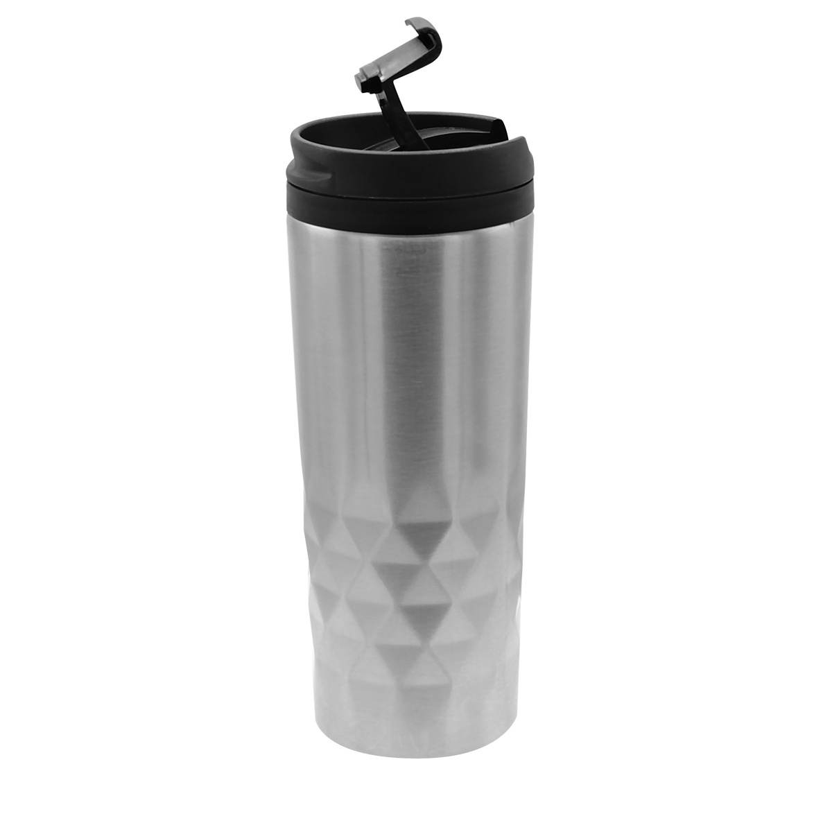 Стильная термокружка изготовлена из нержавеющей стали и дополнена оригинальными геометрическими деталями. Внутренняя колба сделана из пластика. Удобная крышка не даст расплескаться напитку. Объем термокружки – 500 мл.- Виды нанесений: Гравировка-А2 (оптоволоконный лазер), Гравировка Круговая (оптоволоконный лазер), УФ-печать А2, УФ - DTF, УФ-Лак, УФ-Цвет+Лак