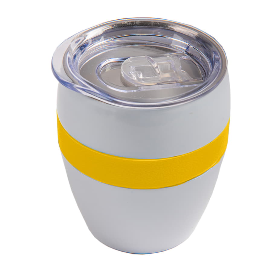 Термокружка LINE с двойными стальными стенками сохранит напиток горячим до 3х часов, холодным - до 4х часов. Благодаря форме удачно лежит в руке, и за счет резинового браслета не скользит. Высота без крышки 9,7 см, подходит для большинства кофемашин. -