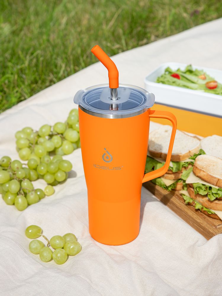 - 2 крышки в комплекте: одна на 100% герметичная с механизмом блокировки отверстия для питья, вторая — с отверстием для трубочки