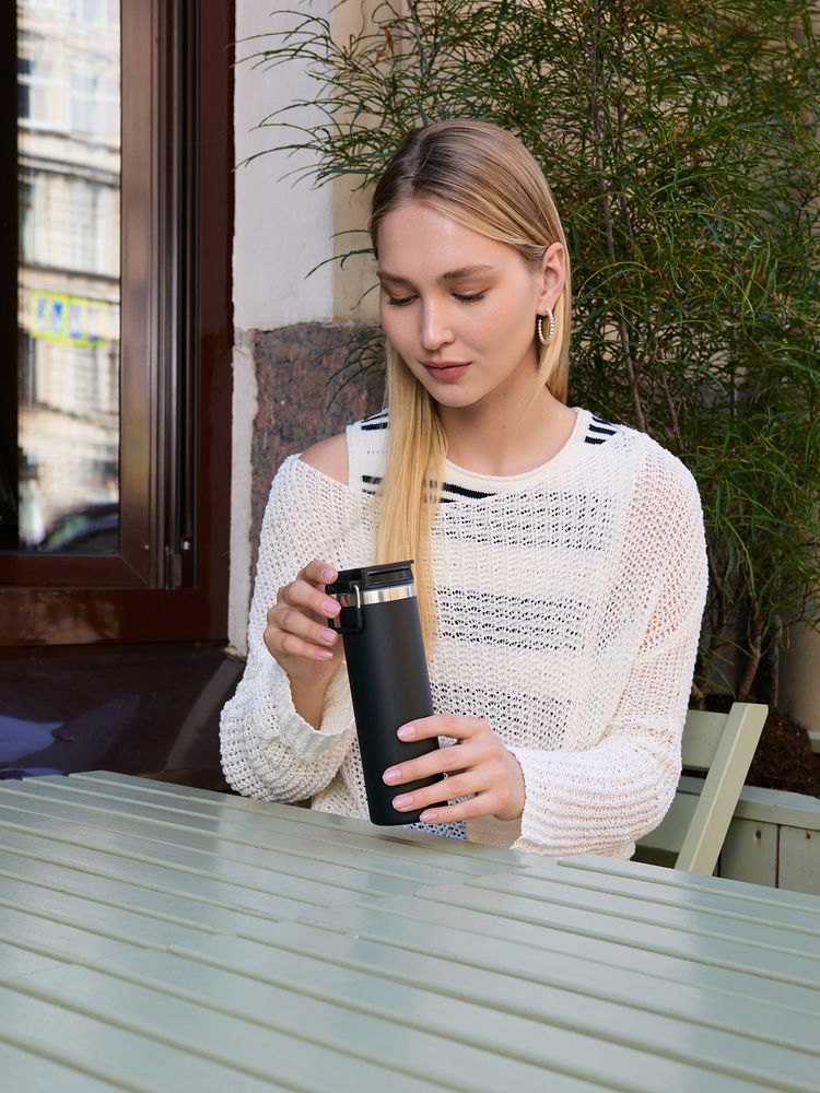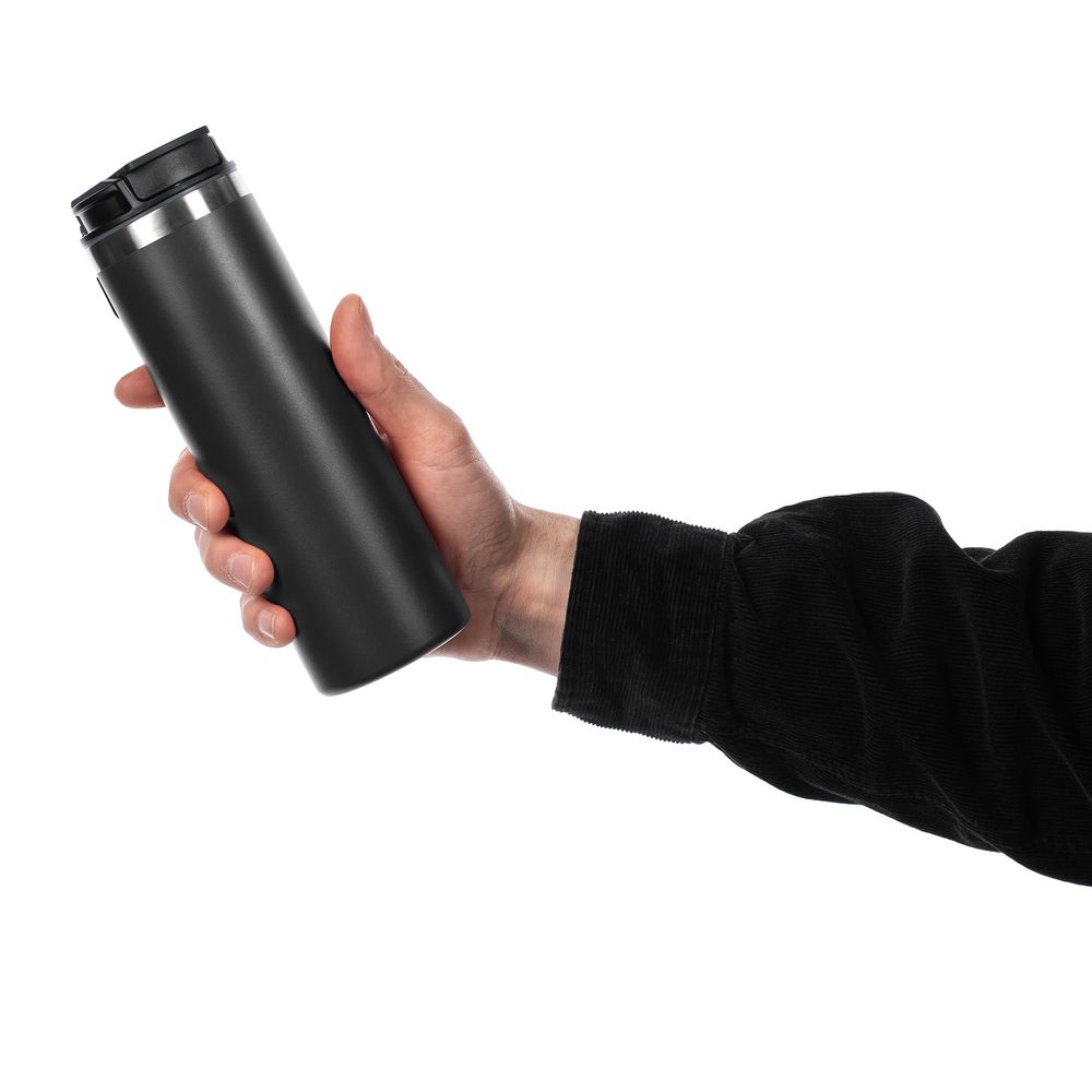 Лаконичный дизайн с ровным цилиндрическим корпусом — специально для круговой печати и гравировки, достаточный объем и привлекательная деталь в виде подвижной квадратной ручки для переноски.Емкость 450 мл.