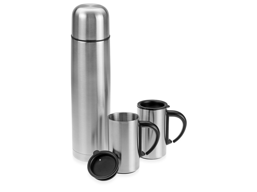 Отличный набор, состоящий из термоса на 1000 мл и двух термокружек на 300 мл, пригодится и в дороге, и во время пикника или похода. Нержавеющая сталь не впитывает запахи и отлично удерживает тепло более 24 часов. Термокружки идут со специальными пластиковыми крышками. Упакован в картонную коробку с мягким поролоновым ложементом. -