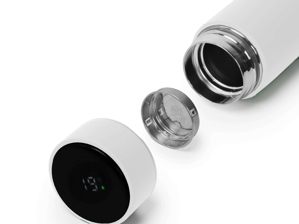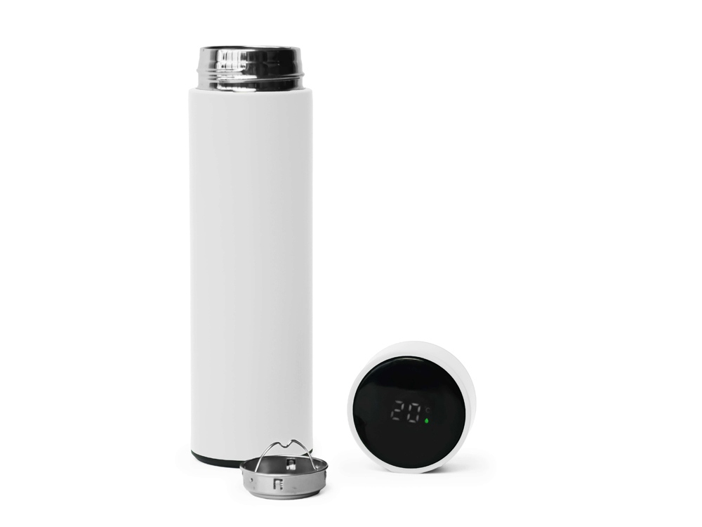 Термос из нержавеющей стали, покрытый цветным soft touch, с крышкой, в которой встроен термометр и LED дисплей, показывающий температуру внутри термоса. Объем: 500 мл. Упаковка: каждый термос в крафт коробке. -
