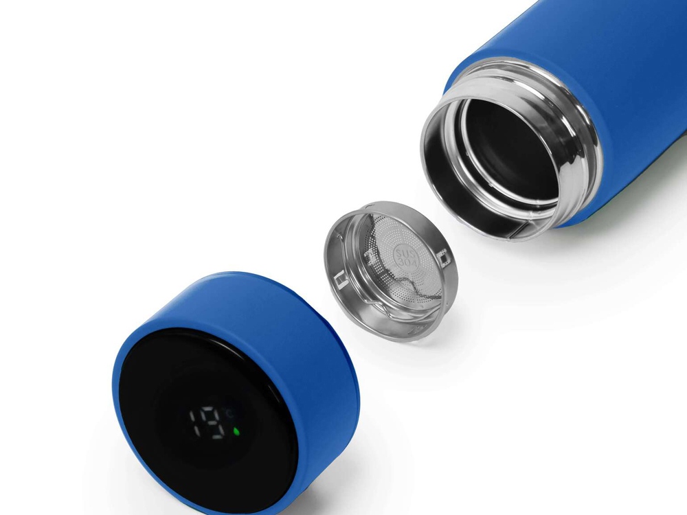 Термос из нержавеющей стали, покрытый цветным soft touch, с крышкой, в которой встроен термометр и LED дисплей, показывающий температуру внутри термоса. Объем: 500 мл. Упаковка: каждый термос в крафт коробке. -