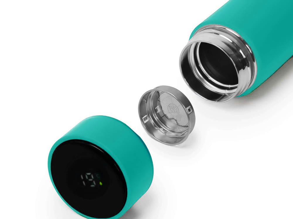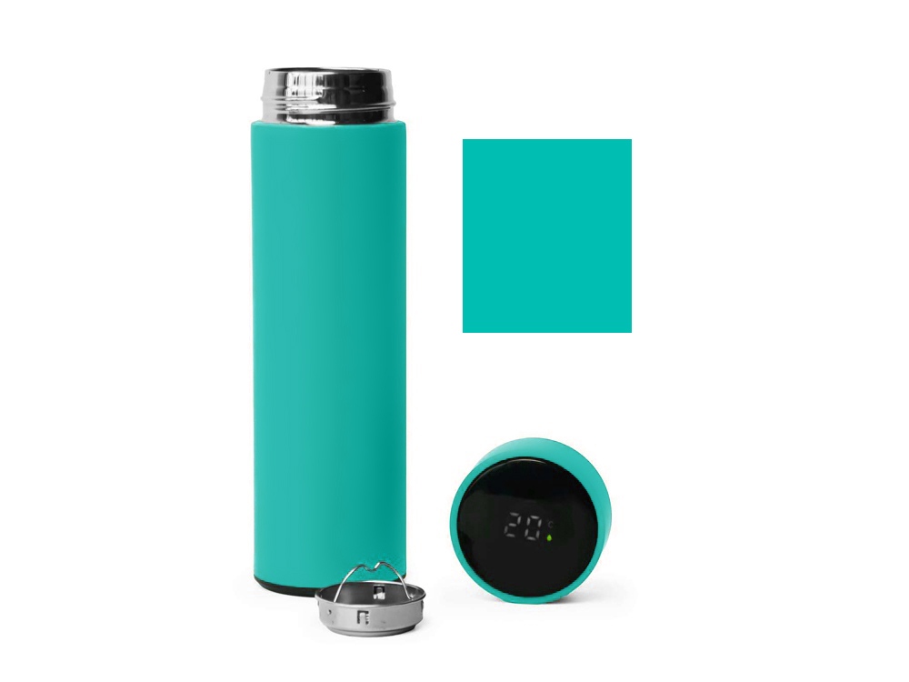 Термос из нержавеющей стали, покрытый цветным soft touch, с крышкой, в которой встроен термометр и LED дисплей, показывающий температуру внутри термоса. Объем: 500 мл. Упаковка: каждый термос в крафт коробке. -
