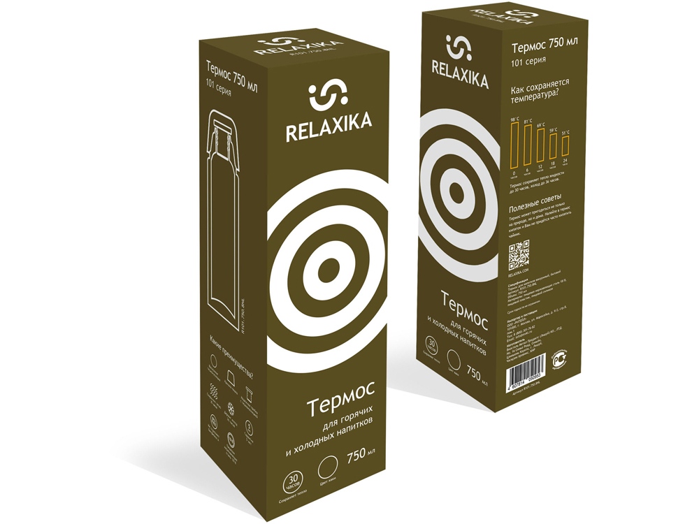 Классический термос Relaxika с высокими показателями удержания температуры напитка для походов, путешествий, спорта и ежедневного использования. Прочные двойные стенки из высококачественной нержавеющей стали 18/8 с вакуумной изоляцией гарантируют, что ваш напиток останется холодным в течение 36 часов и горячим до 30 часов. Этот материал не только прочен, но и гигиеничен, не выделяет никаких вредных для здоровья веществ. Ваши напитки сохраняет естественный вкус и не приобретут посторонний запах. Напиток остается холодным до 36 часов и горячим до 30 часов.