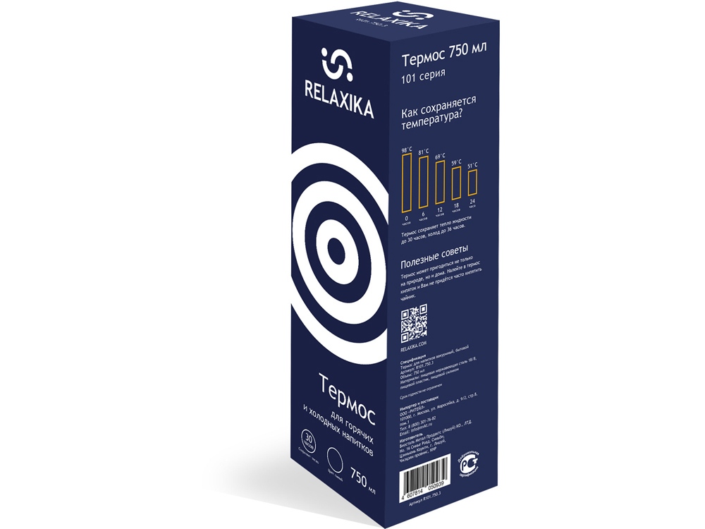 Классический термос Relaxika с высокими показателями удержания температуры напитка для походов, путешествий, спорта и ежедневного использования. Прочные двойные стенки из высококачественной нержавеющей стали 18/8 с вакуумной изоляцией гарантируют, что ваш напиток останется холодным в течение 36 часов и горячим до 30 часов. Этот материал не только прочен, но и гигиеничен, не выделяет никаких вредных для здоровья веществ. Ваши напитки сохраняет естественный вкус и не приобретут посторонний запах. Напиток остается холодным до 36 часов и горячим до 30 часов.