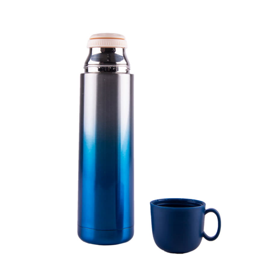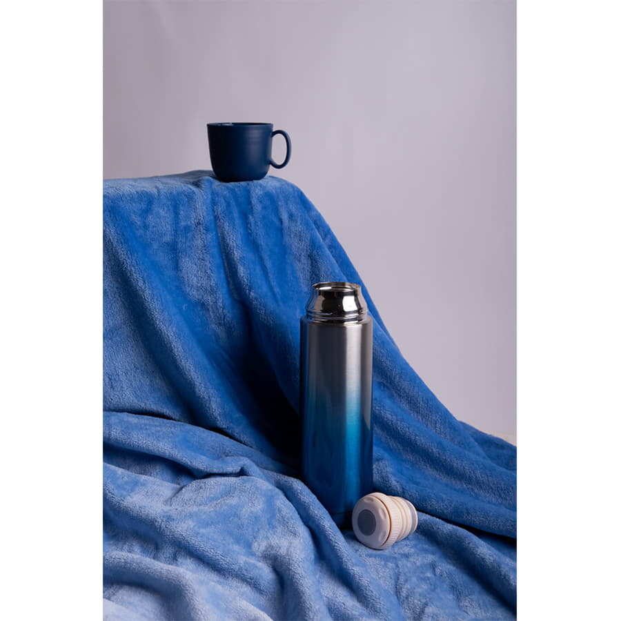 Вакуумный термос Gradient с двойными стальными стенками. Очень удобная форма крышки-чашки. Отделка - плавный градиент из серебряного в насыщенный синий цвет. Сохраняет тепло до 12 часов в зависимости от температуры окружающей среды. -