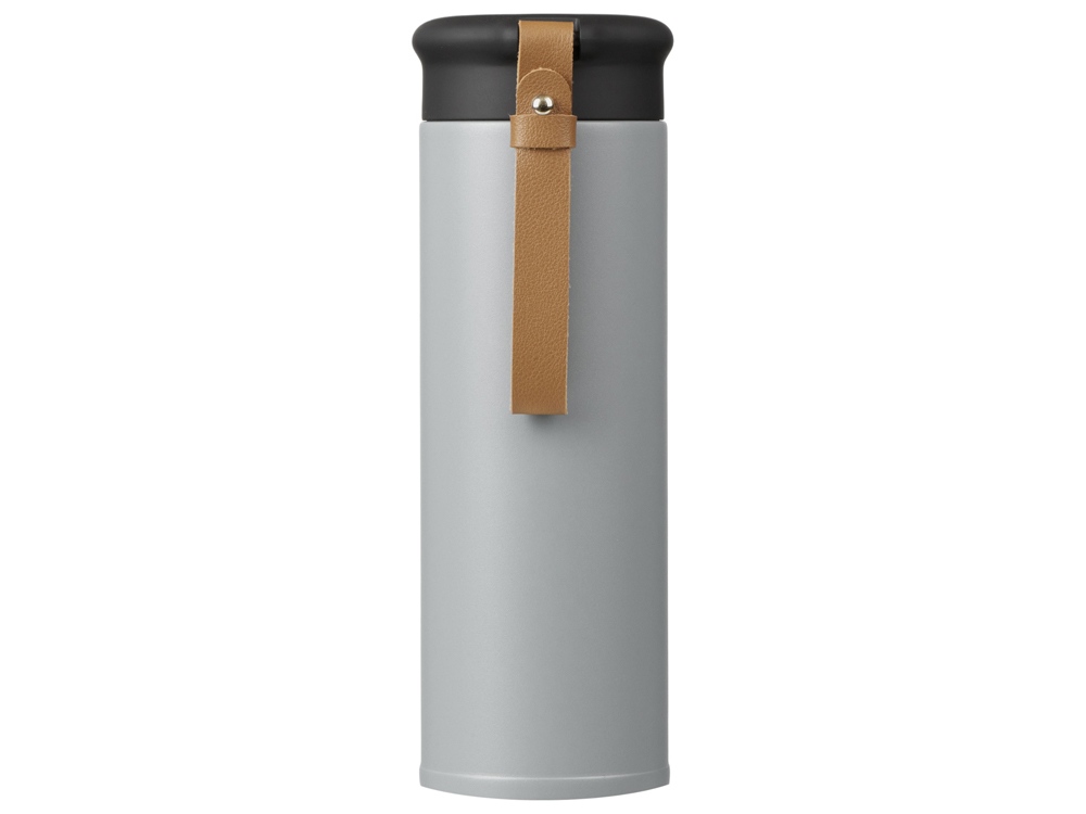 Термос герметично завинчивается на крышку, оснащенную съемным ремешком из качественной ПУ кожи. Крышка имеет прорезиненное покрытие, что создает интересное сочетание текстур в рамках одной модели. Корпус имеет элегантную рельефную поверхность с антискользящим эффектом.