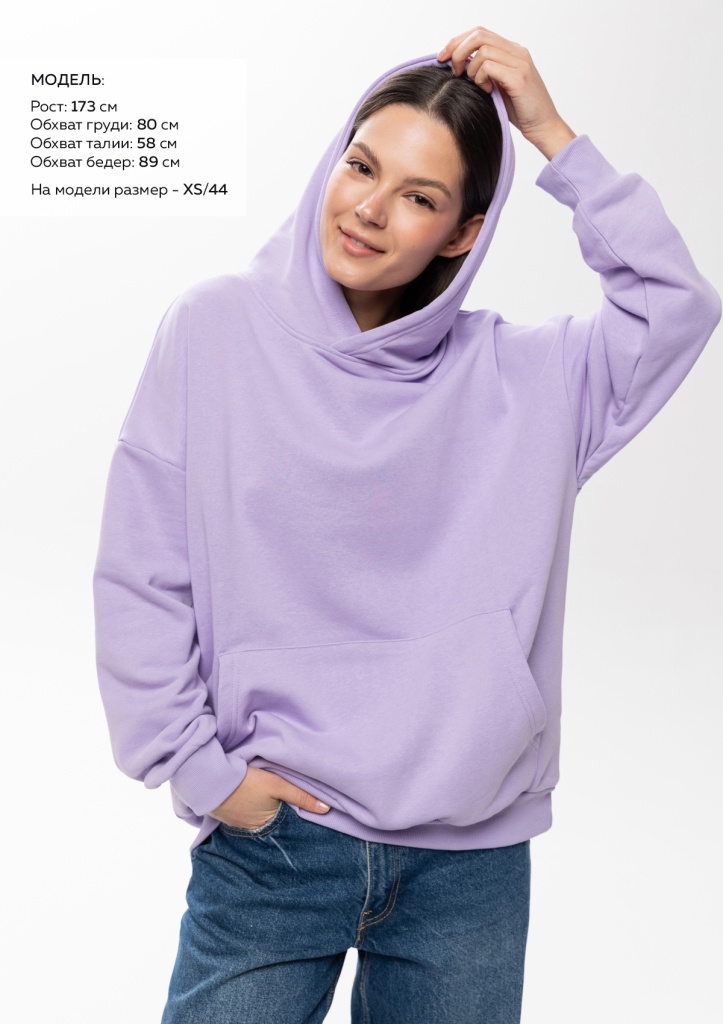 Размер женского худи: XS/44. Параметры модели: рост 173 см.; обхват груди 80 см.; обхват талии 58 см.; обхват бедер 89 см.