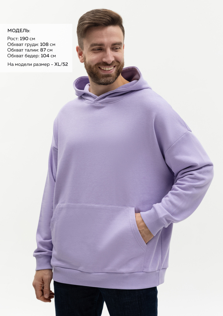 Размер мужского худи: XL/52. Параметры модели: рост 190 см.; обхват груди 108 см.; обхват талии 87 см.; обхват бедер 104 см.