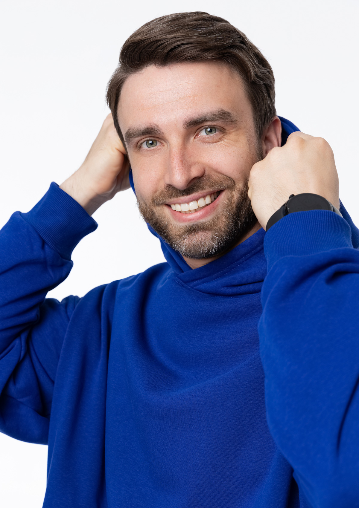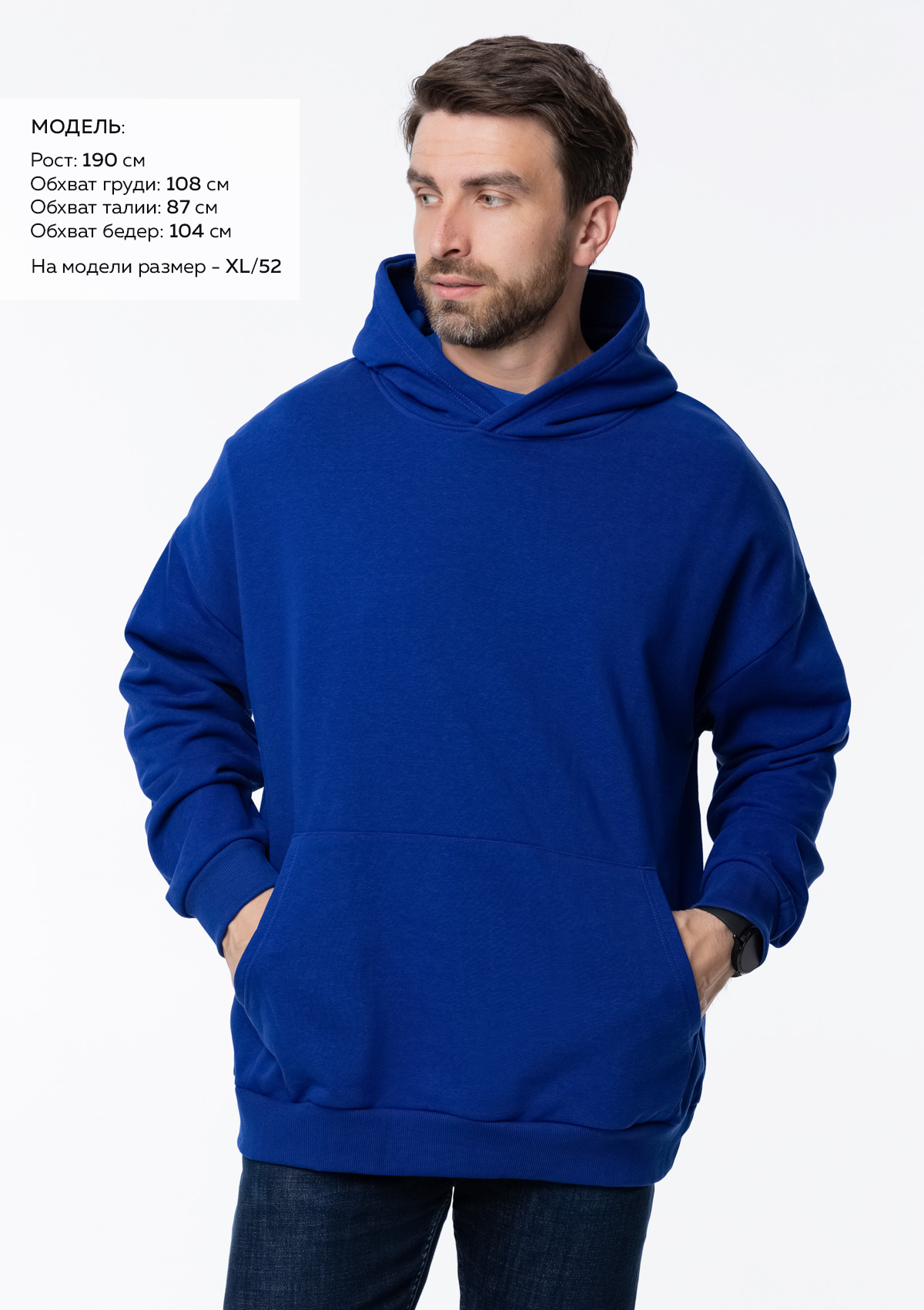 Размер мужского худи: XL/52. Параметры модели: рост 190 см.; обхват груди 108 см.; обхват талии 87 см.; обхват бедер 104 см. -