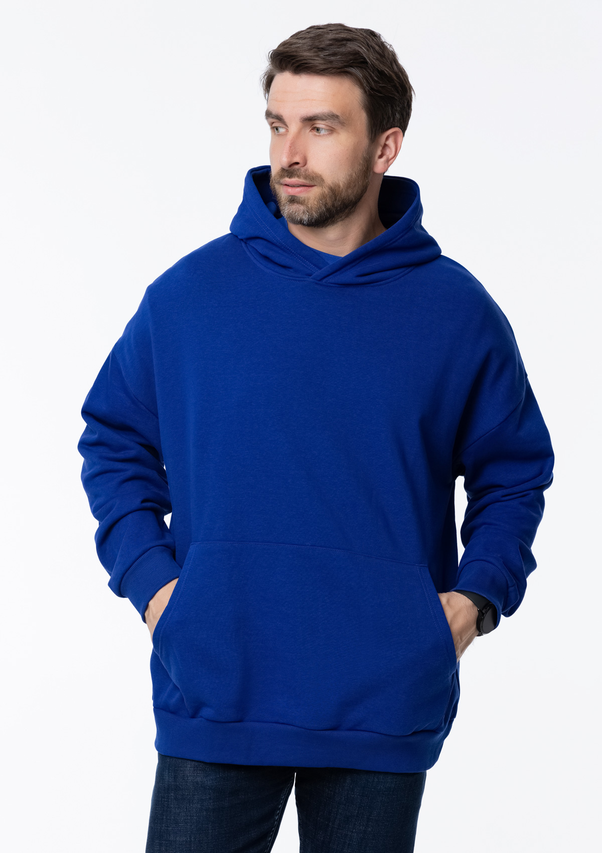 Универсальная толстовка свободного силуэта с капюшоном комфортной глубины, спущенной линией плеча и глубоким карманом-кенгуру. Манжет и низ изделия оформлены широкой эластичной резинкой.