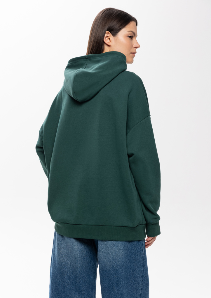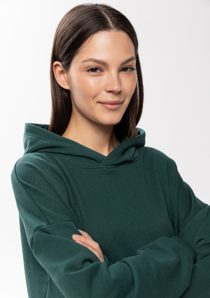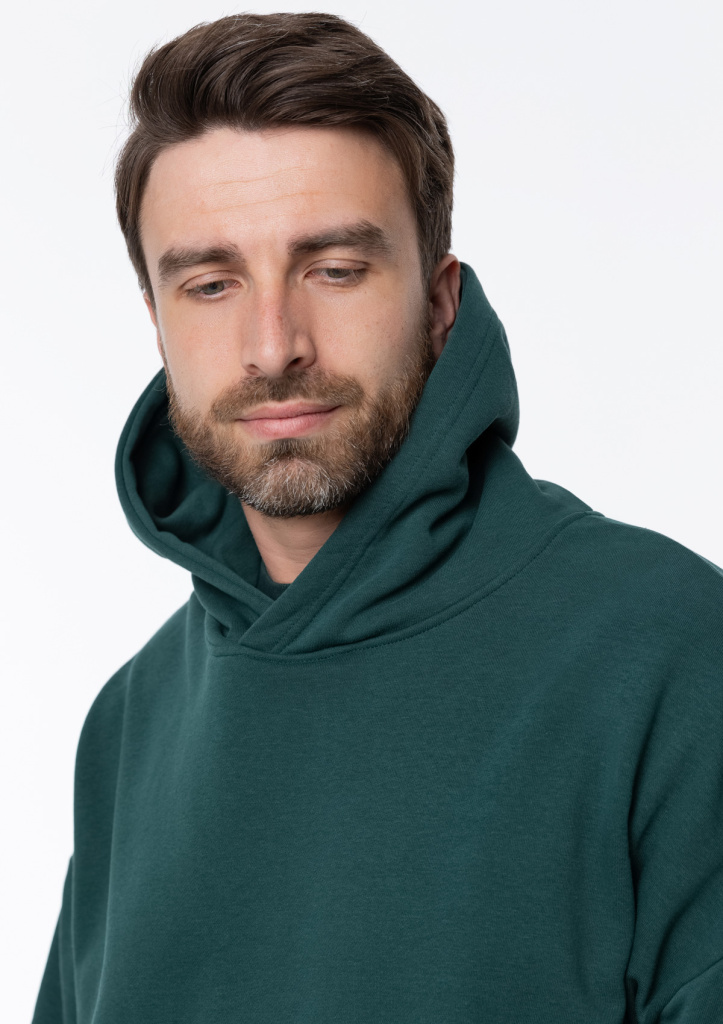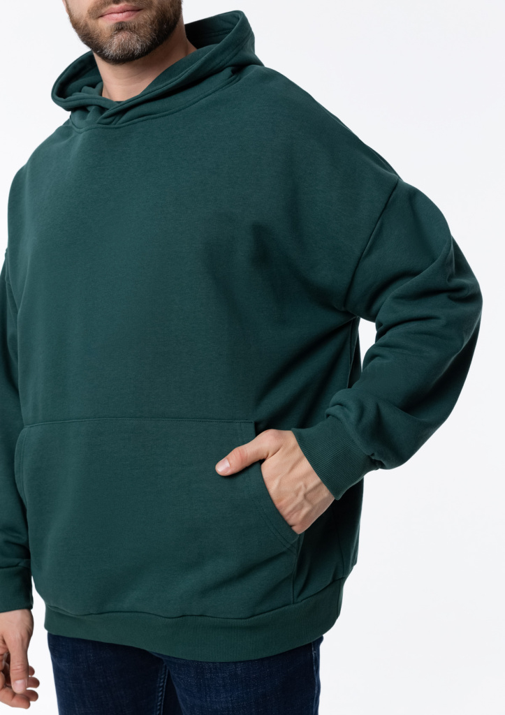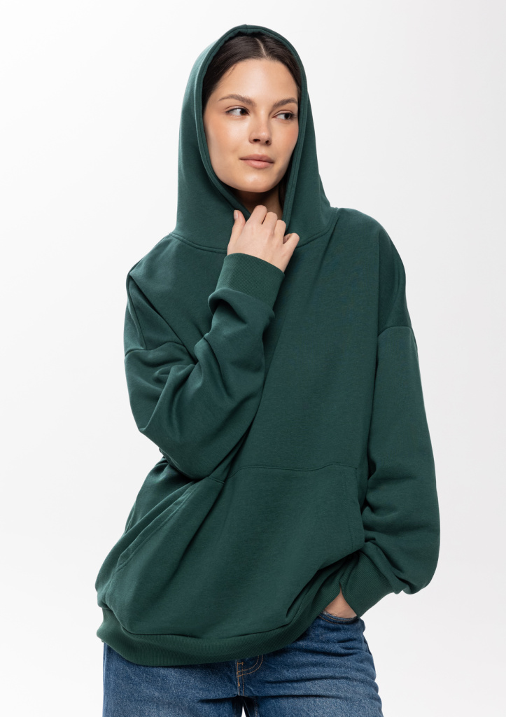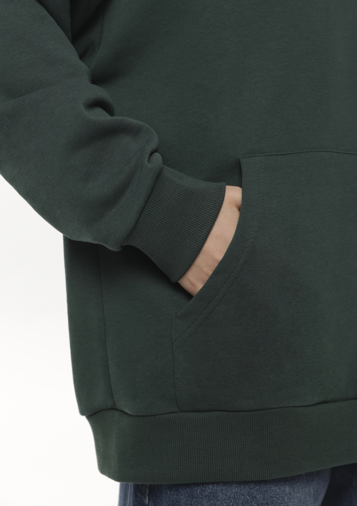 Универсальная толстовка свободного силуэта с капюшоном комфортной глубины, спущенной линией плеча и глубоким карманом-кенгуру. Манжет и низ изделия оформлены широкой эластичной резинкой.