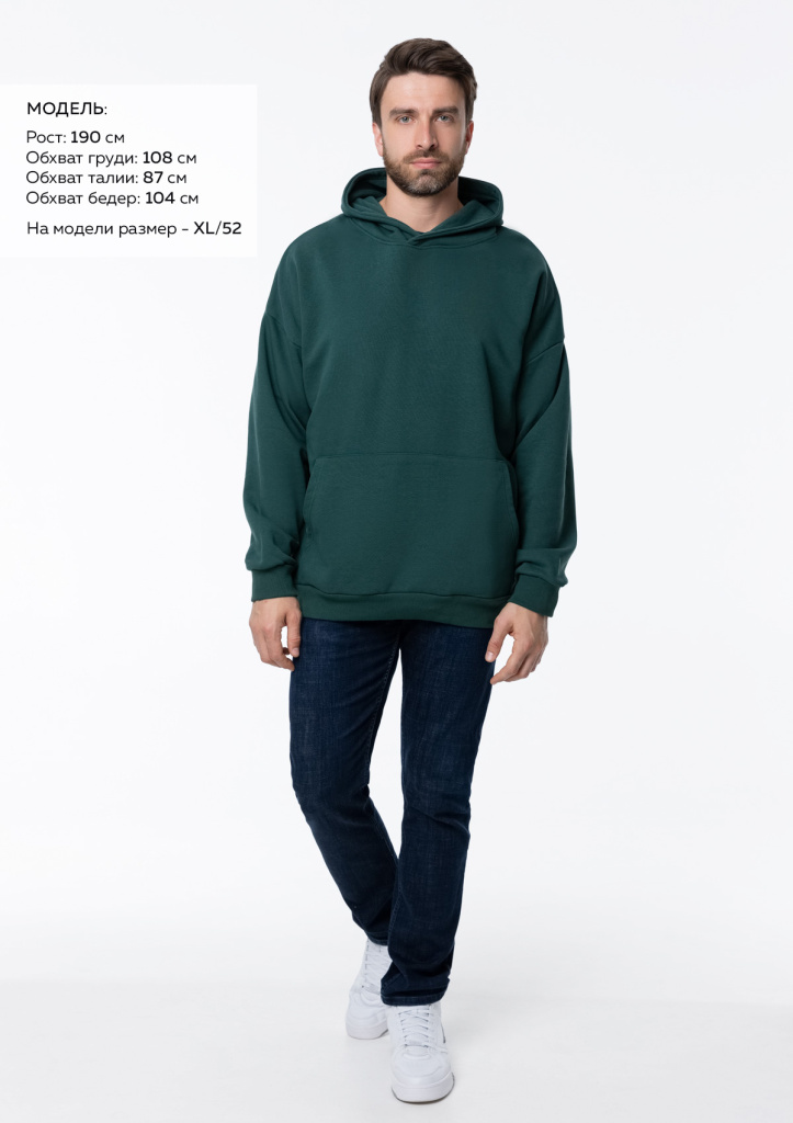 Размер мужского худи: XL/52. Параметры модели: рост 190 см.; обхват груди 108 см.; обхват талии 87 см.; обхват бедер 104 см. -