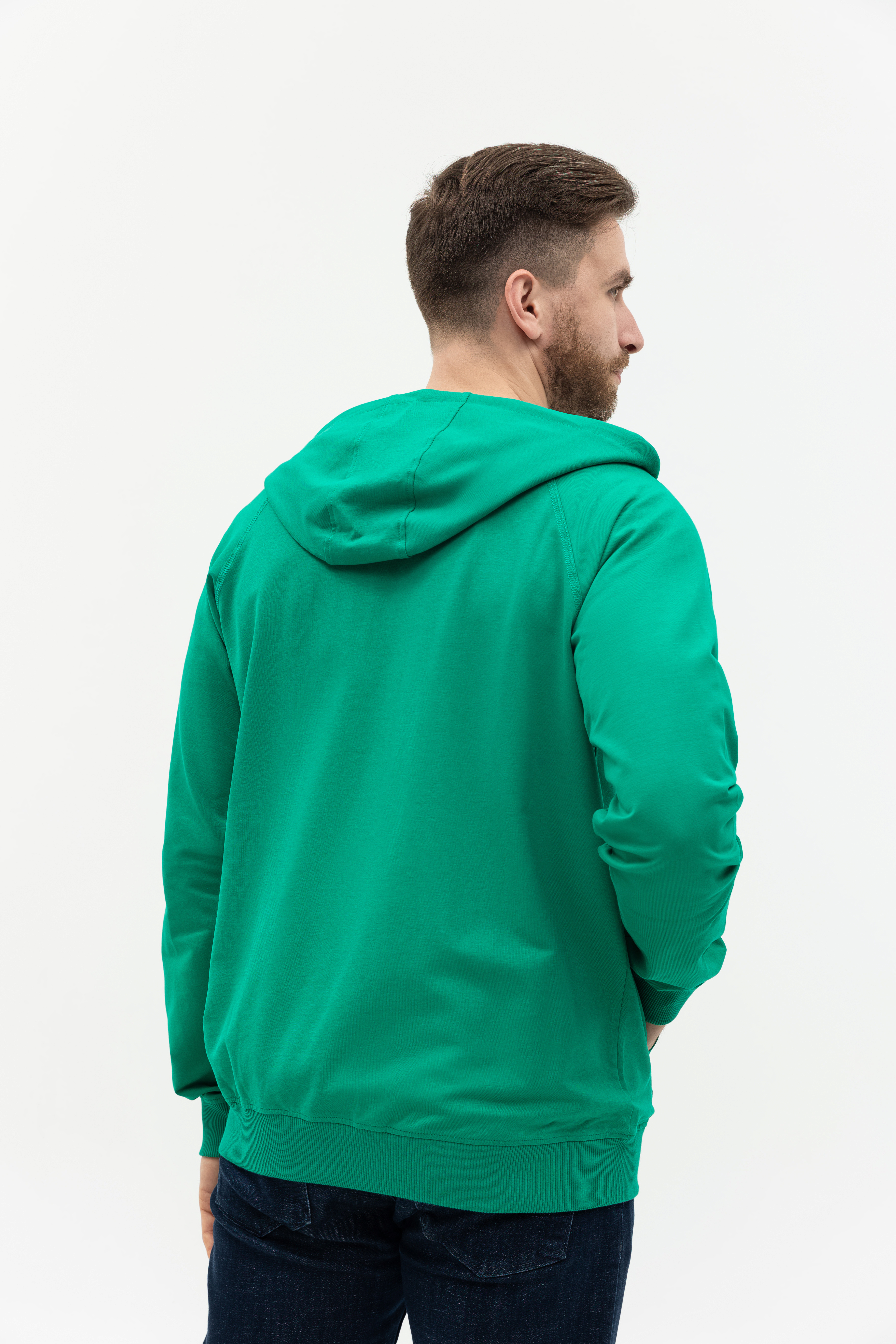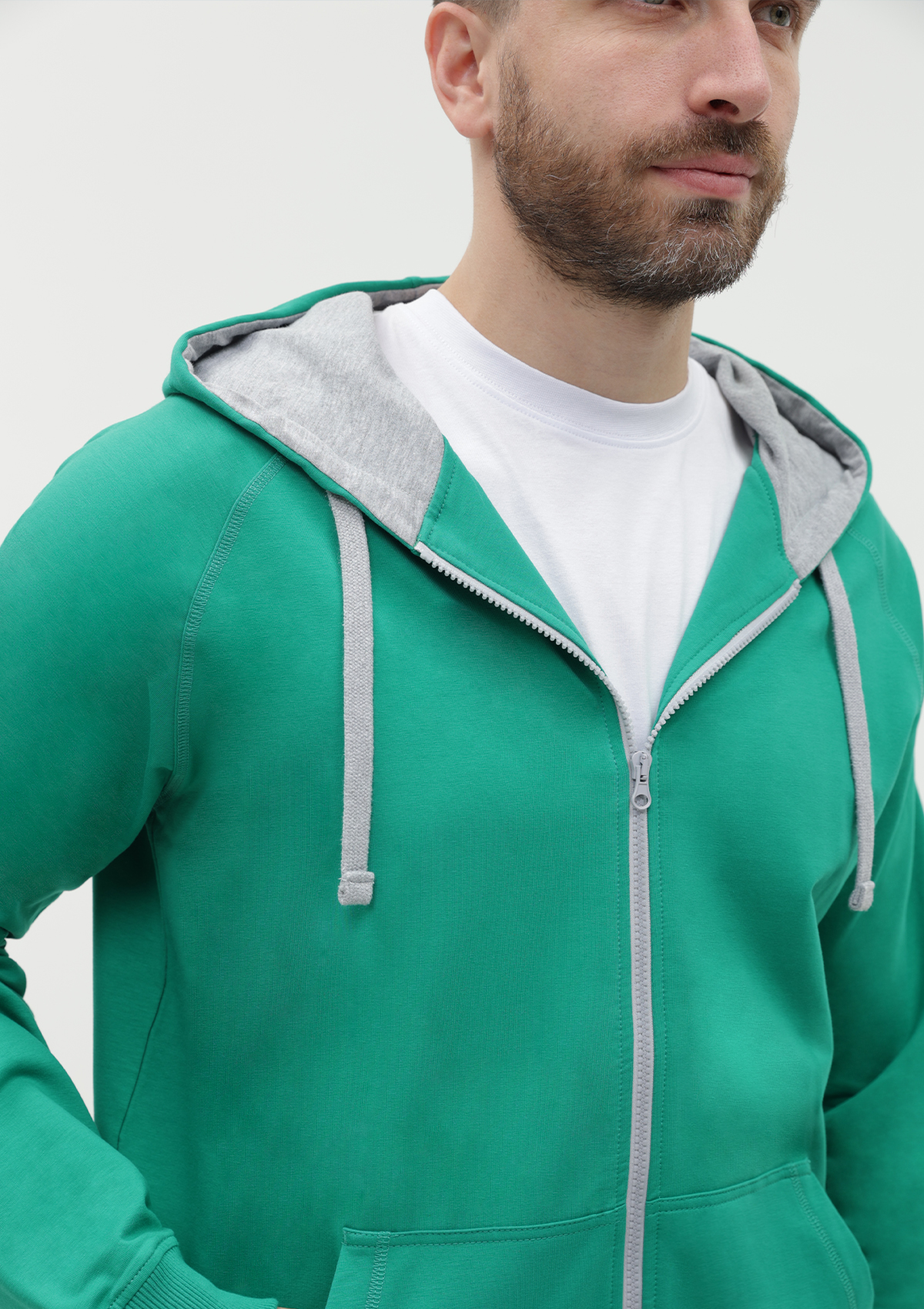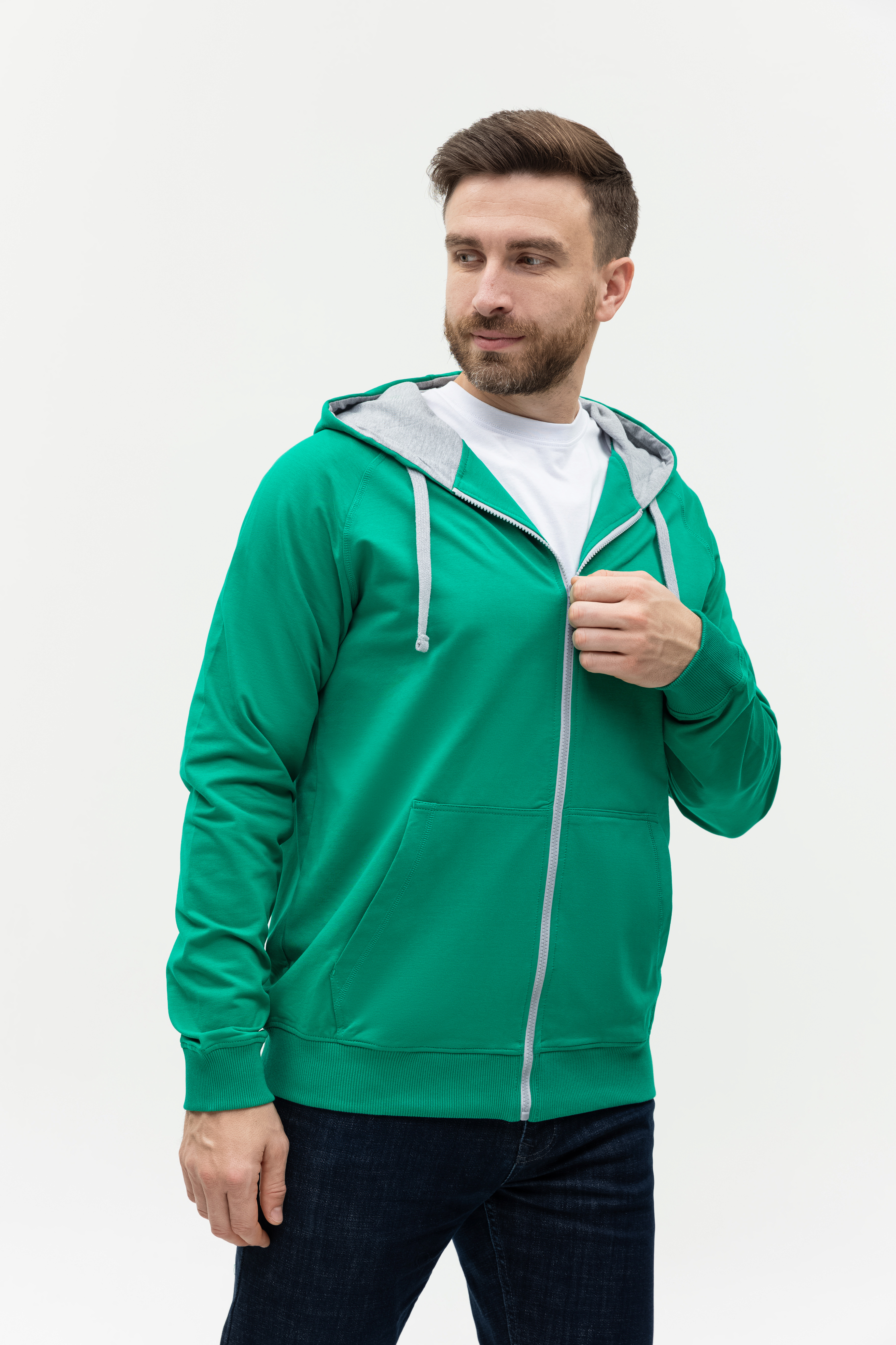 Мужская толстовка прямого силуэта с капюшоном комфортной глубины, рукавом-реглан, глубоким накладным карманом и застежкой на молнию контрастного цвета. Капюшон дополнен шнурком для регулирования прилегания, манжет и низ изделия оформлены широкой эластичной резинкой.