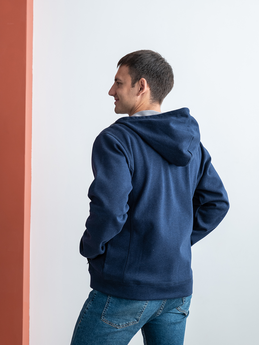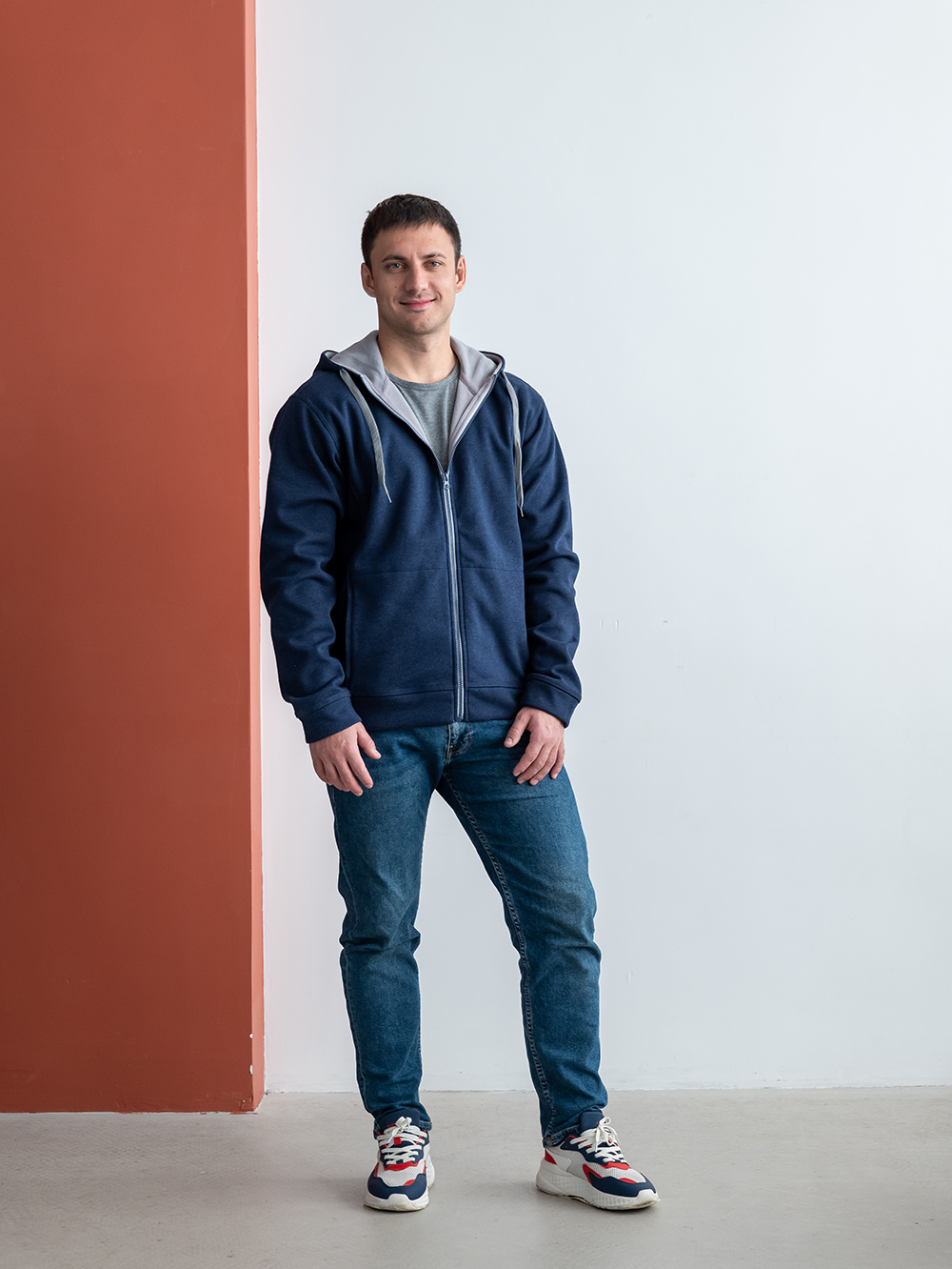 Мужская толстовка прямого силуэта с капюшоном комфортной глубины, втачным рукавом, прорезным карманов и застежкой на контрастную молнию. Капюшон дополнен плоским шнурком для регулировки прилегания, манжет и низ изделия выполнены из основного полотна.