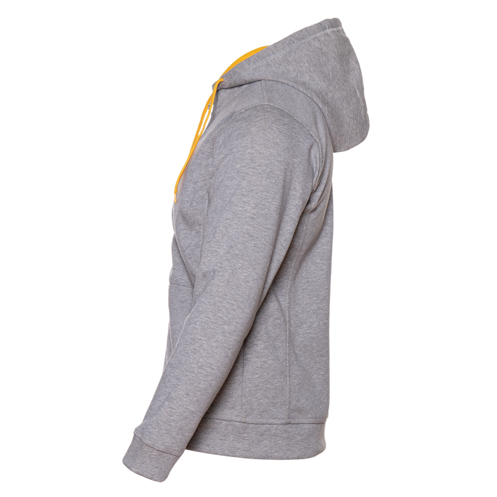 Мужская толстовка прямого силуэта с капюшоном комфортной глубины, втачным рукавом, прорезным карманов и застежкой на контрастную молнию. Капюшон дополнен плоским шнурком для регулировки прилегания, манжет и низ изделия выполнены из основного полотна.