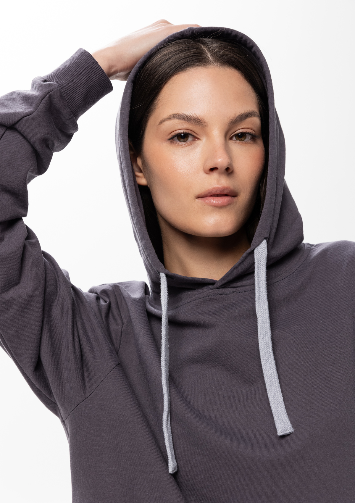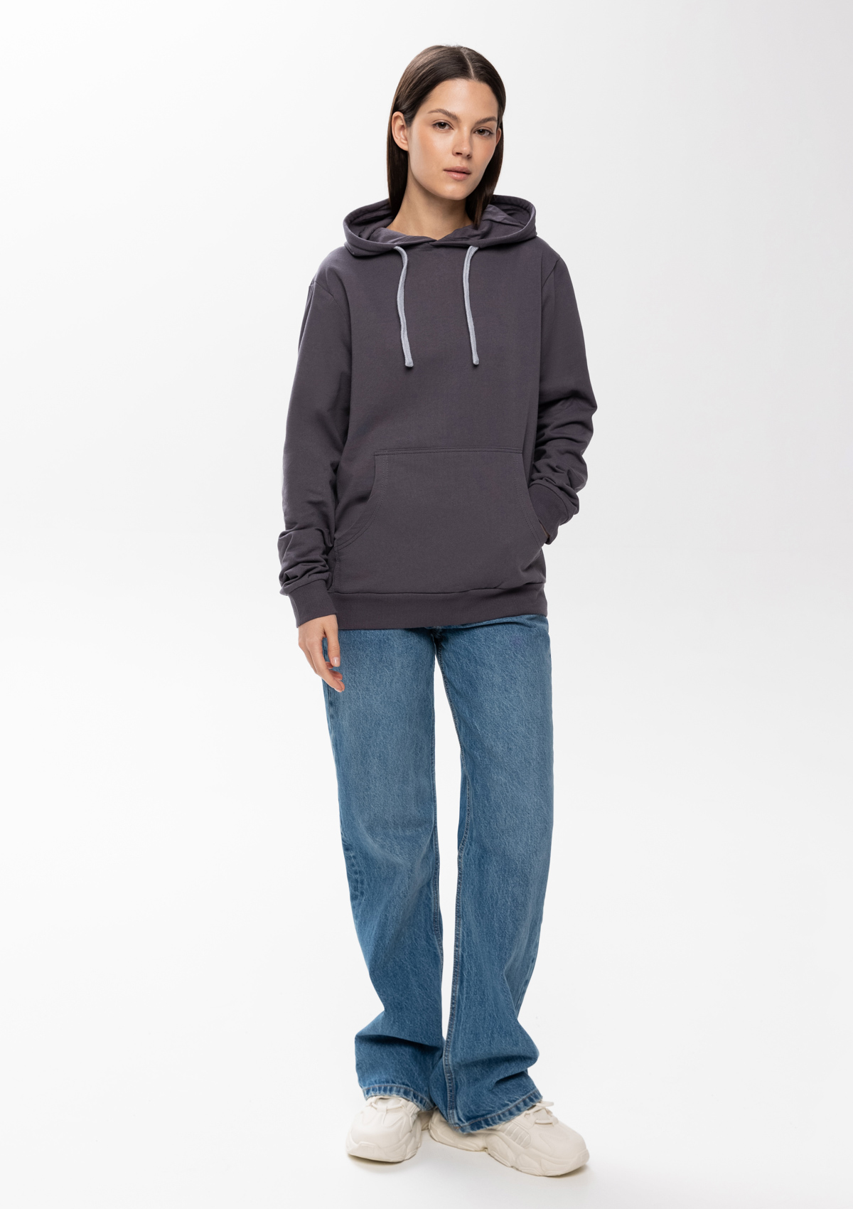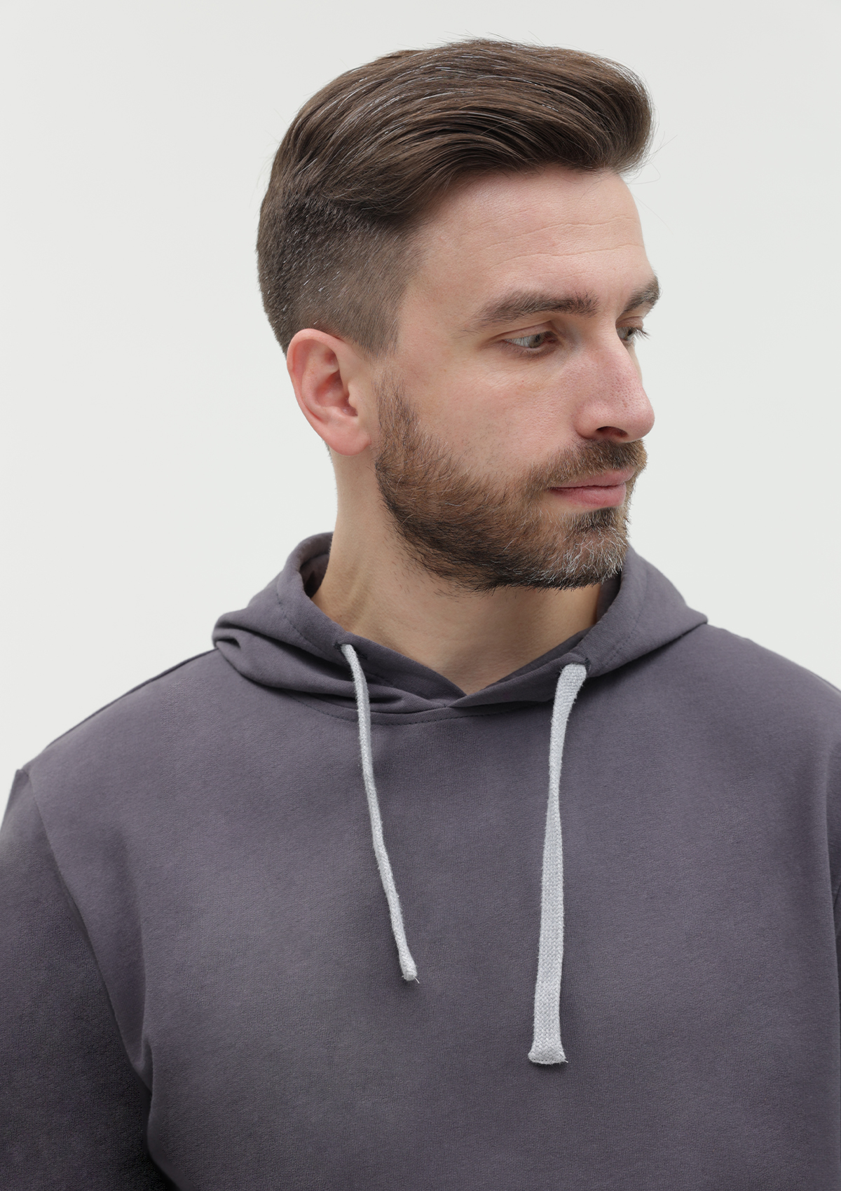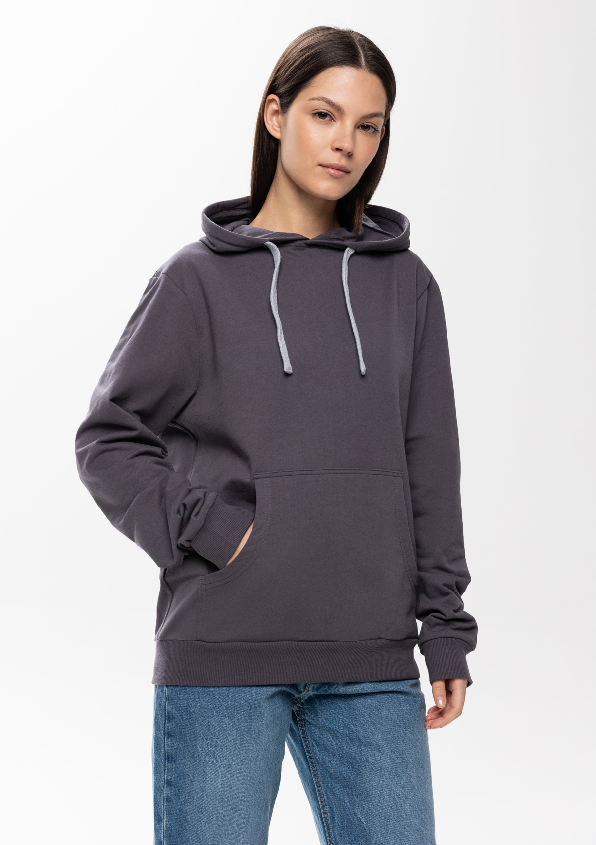 Толстовка прямого силуэта с капюшоном, втачным рукавом и карманом-кенгуру. Капюшон дополнен шнурком для регулирования прилегания, манжет и низ изделия оформлены широкой эластичной резинкой. Возможно два варианта исполнения: контрастные шнурок и бейка/шнурок и бейка в цвет толстовки.