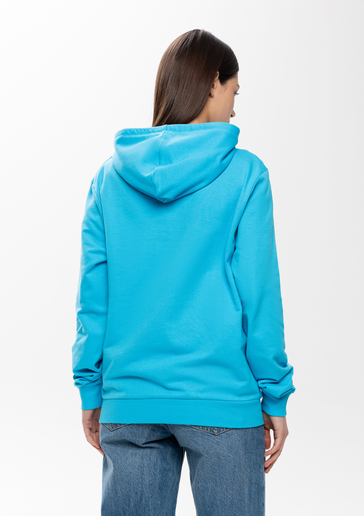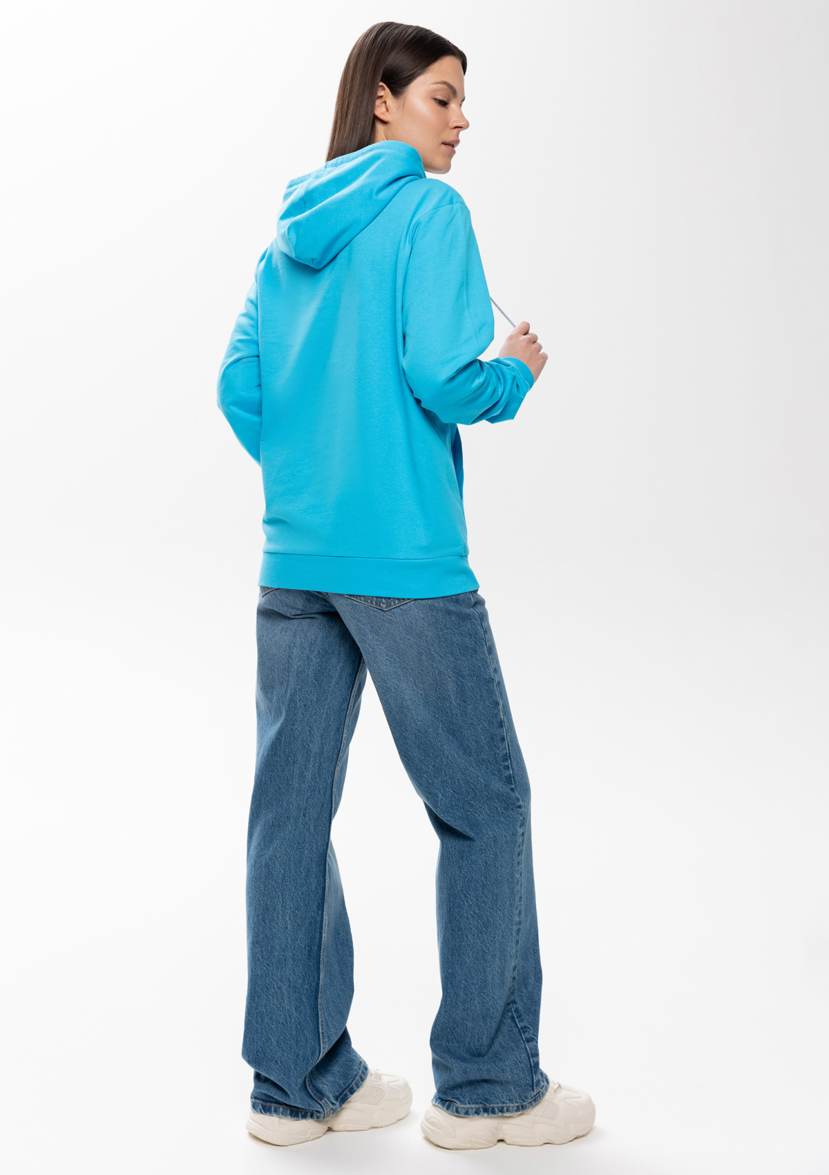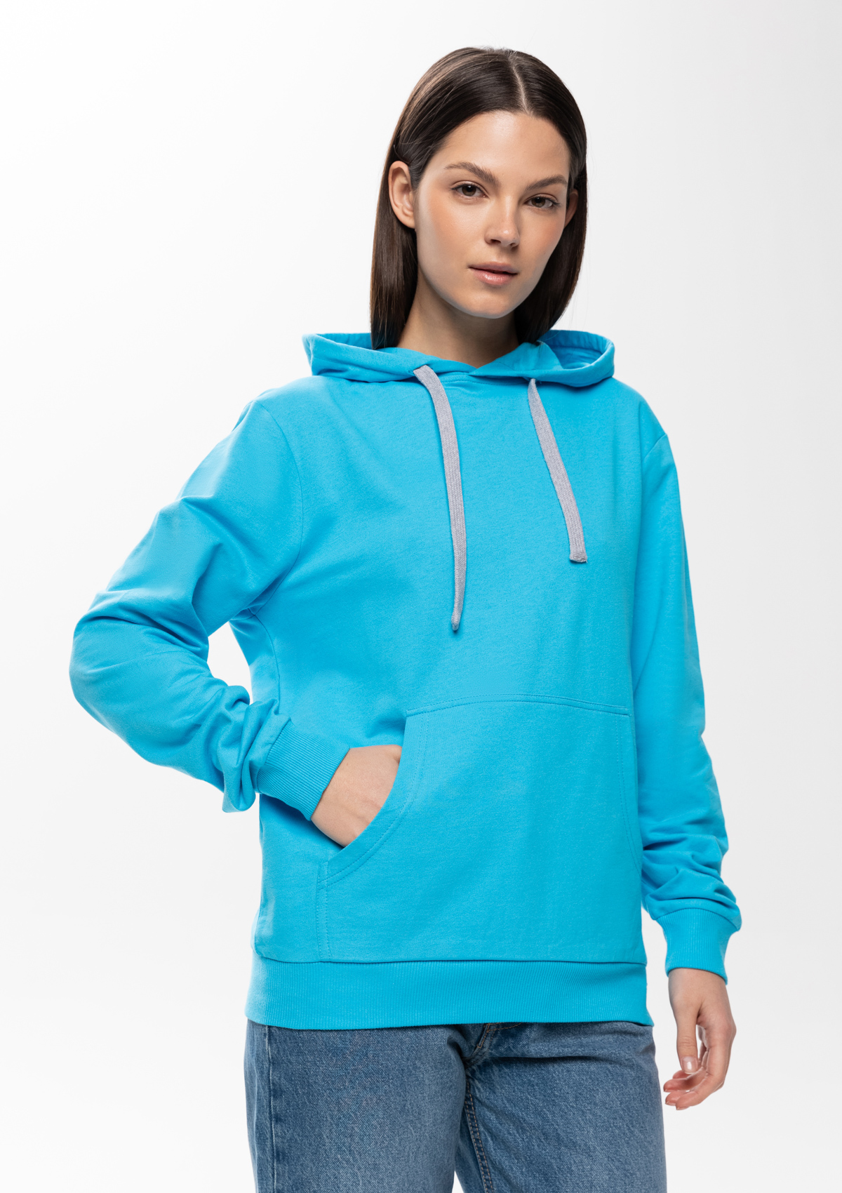 Толстовка прямого силуэта с капюшоном, втачным рукавом и карманом-кенгуру. Капюшон дополнен шнурком для регулирования прилегания, манжет и низ изделия оформлены широкой эластичной резинкой. Возможно два варианта исполнения: контрастные шнурок и бейка/шнурок и бейка в цвет толстовки.