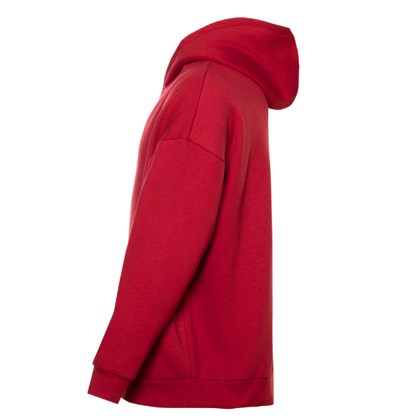 Толстовка свободного силуэта с капюшоном комфортной глубины, спущенной линией плеча и глубоким карманом-кенгуру. Манжет и низ изделия оформлены широкой эластичной резинкой в тон основному цвету.