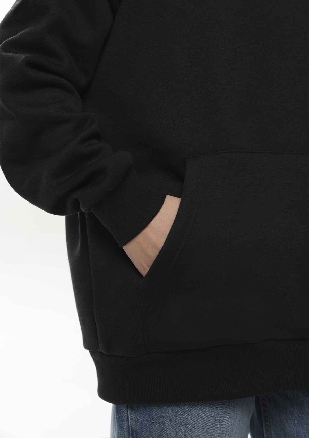 Толстовка свободного силуэта с капюшоном комфортной глубины, спущенной линией плеча и глубоким карманом-кенгуру. Манжет и низ изделия оформлены широкой эластичной резинкой в тон основному цвету.