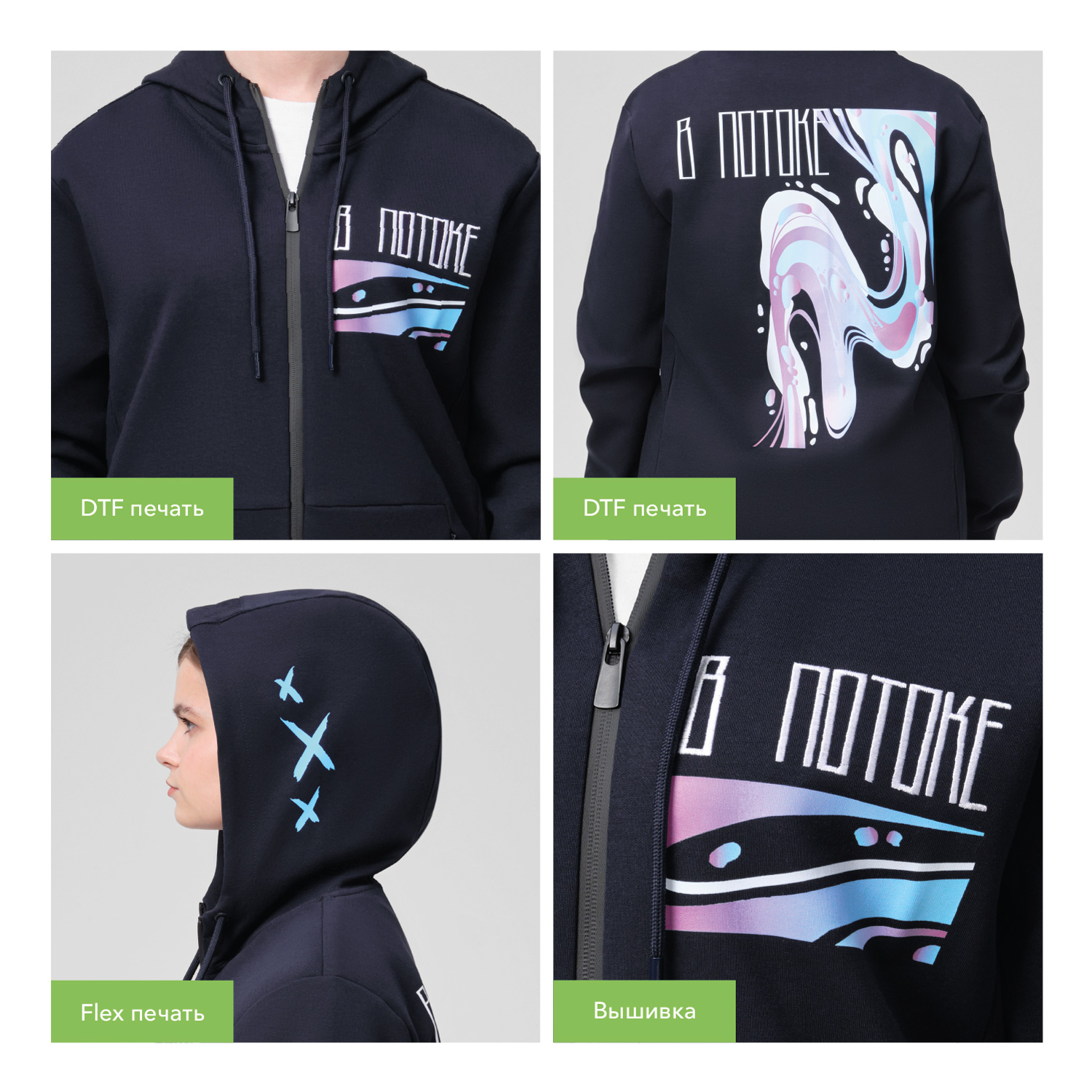 Толстовка сделана из мягкой и прочной ткани интерлок "doubleface", которая приятна к телу и легка в уходе, не растягивается, не выцветает и не деформируется после стирки. Манжеты и низ сделаны из плотной резинки 1х1, благодаря чему вещь держит форму. Карманы на потайных молниях придают толстовке аккуратный вид. Капюшон на подкладке в тон регулируется шнурками.