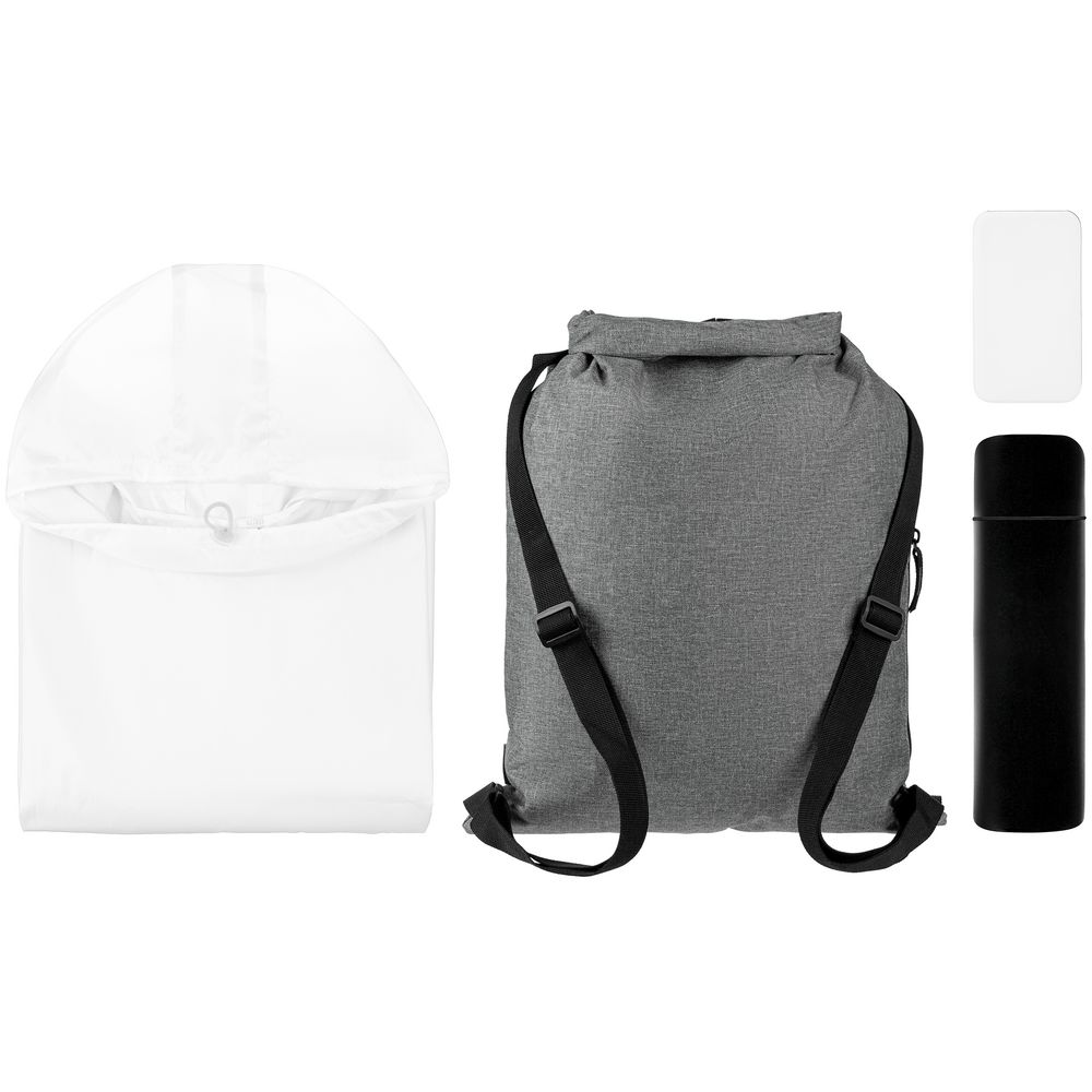 термос - нержавеющая сталь, пластик; аккумулятор - пластик, покрытие софт-тач; дождевик - полиэстер 100%, плотность 60 г/кв.м; таффета; рюкзак - полиэстер, 300D