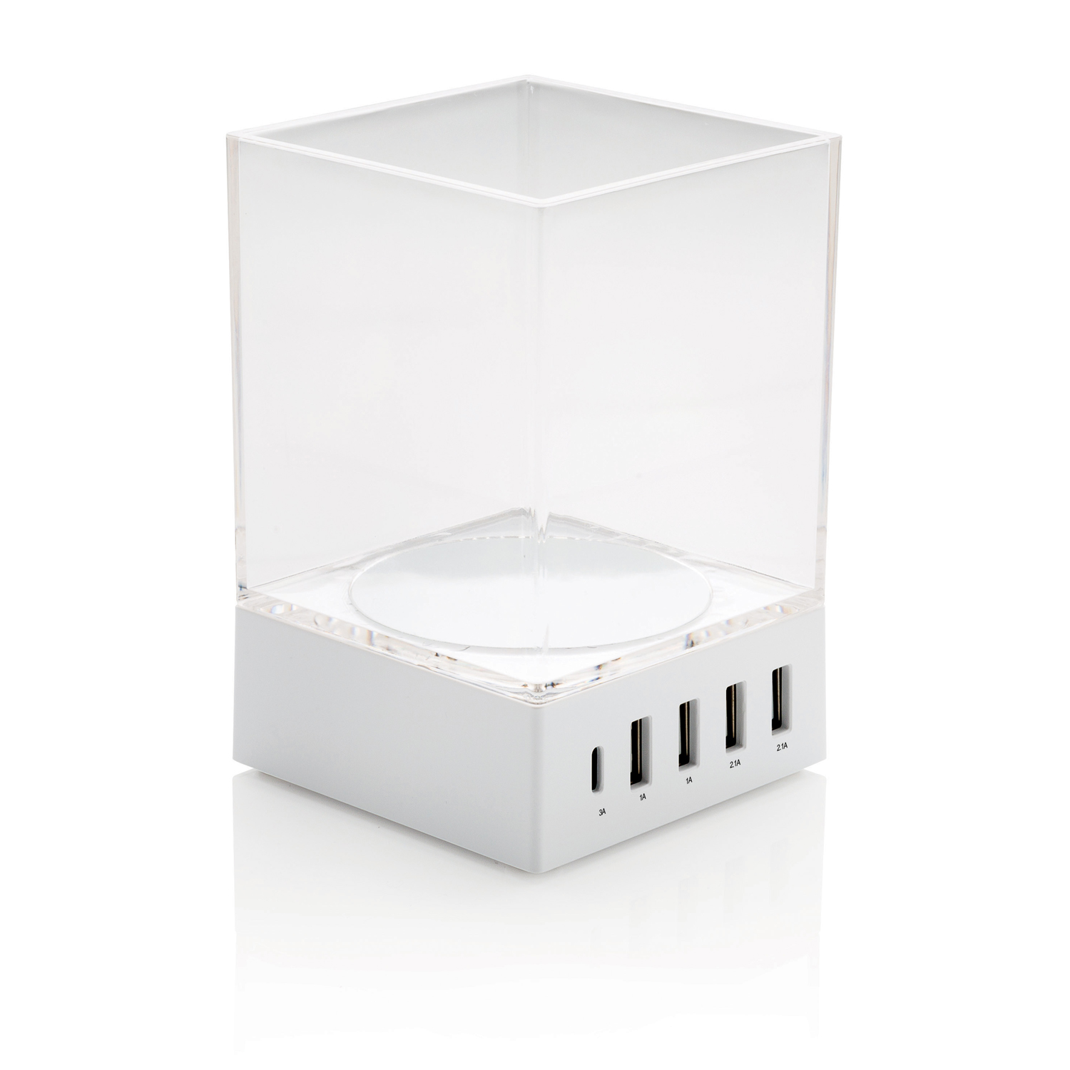 Стильный USB-хаб с подставкой для ручек, выполненный в минималистичном дизайне, проследит, чтобы все устройства были заряжены, а на рабочем столе царил порядок. В устройстве предусмотрены 4 порта USB (4,8 А) и один порт Type-C 2.0 для мобильных устройств нового поколения. Индикаторы синего цвета покажут, заряжается ли устройство. Подставка изготовлена из поликарбоната, а USB-хаб — из огнестойкого ABS-пластика. Длина кабеля — 1,5 метра.