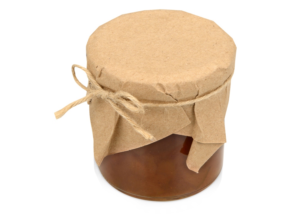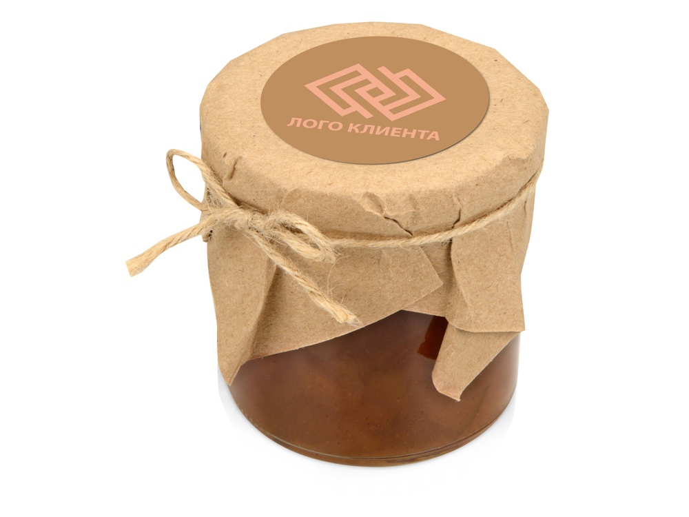 Банка варенья обернута крафт-бумагой, на которую возможно сделать нанесение корпоративного логотипа. -