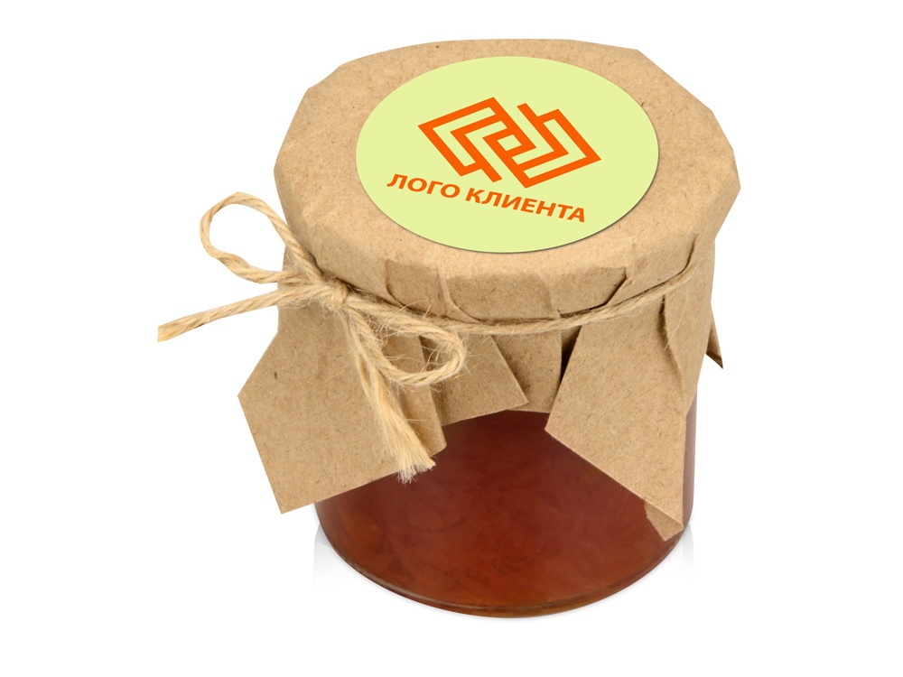 Банка варенья обернута крафт-бумагой, на которую возможно сделать нанесение корпоративного логотипа. -
