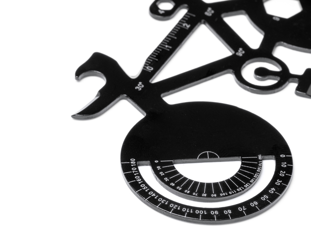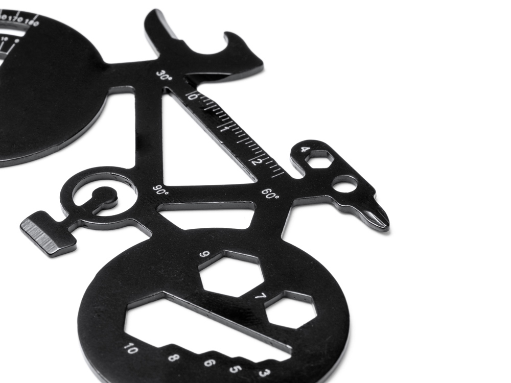 Многофункциональный инструмент из нержавеющей стали в форме велосипеда. 11 функций: открывалка для консервных банок, угловой транспортир, отвертки, гаечные ключи и линейки. -