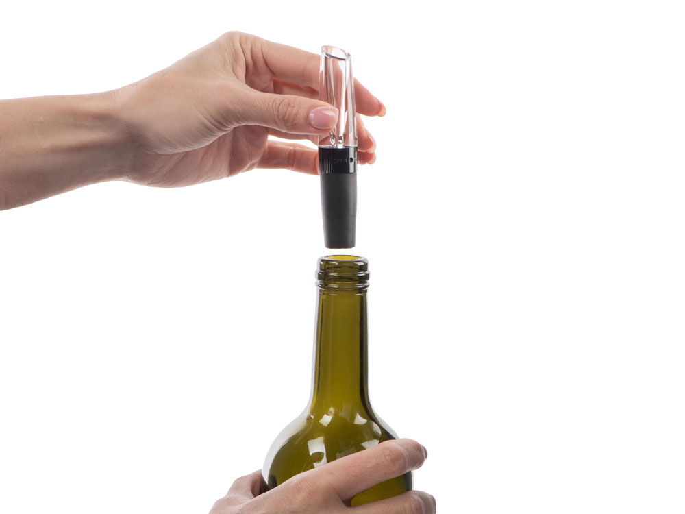 Силиконовая вставка отвечает за плотное прилегание к горлышку бутылки, а прозрачная акриловая вставка позволяет насладиться видом разливающегося вина.