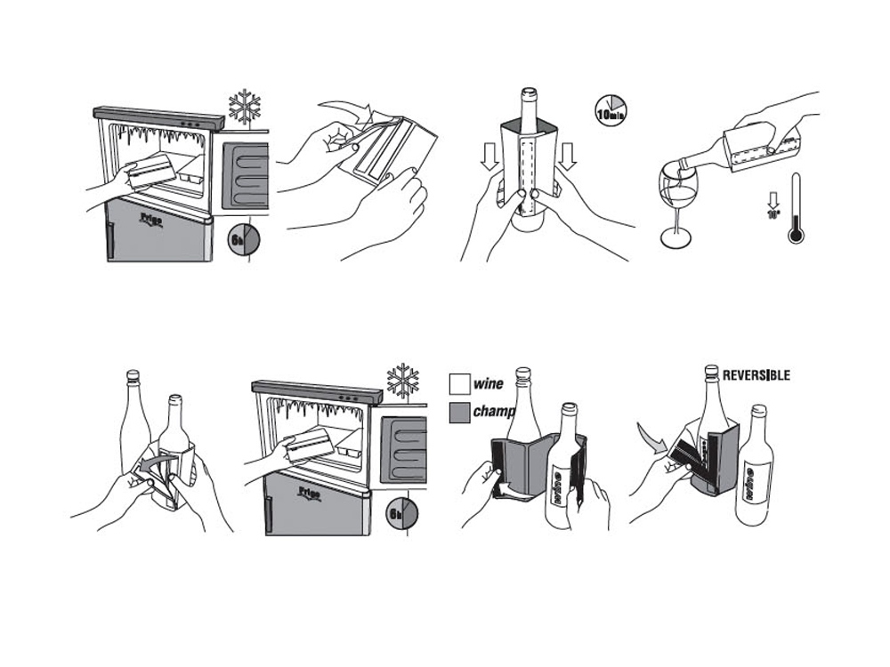 Охладитель-чехол сохранит идеальную температуру бутылки вина или шампанского в течение всего приема пищи. Храните охладитель в морозильной камере, чтобы он был готов к использованию в случае необходимости. Плотно закрепляется на бутылке с помощью липкой ленты. -