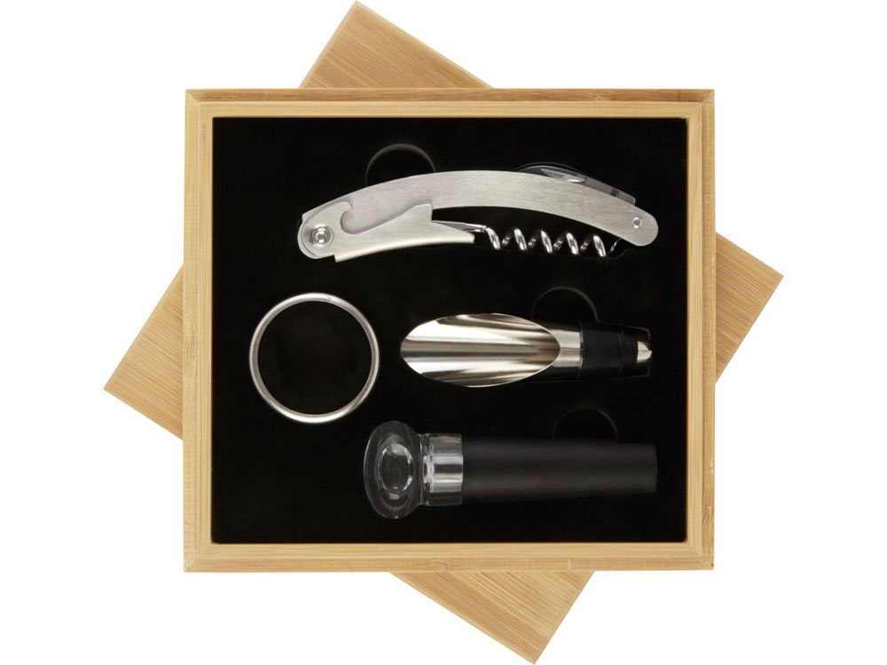 Набор для вина из 4 предметов: штопор, пробка, насадка на бутылку и кольцо. Поставляется в бамбуковой подарочной коробке, изготовленной в соответствии с экологическими стандартами. -
