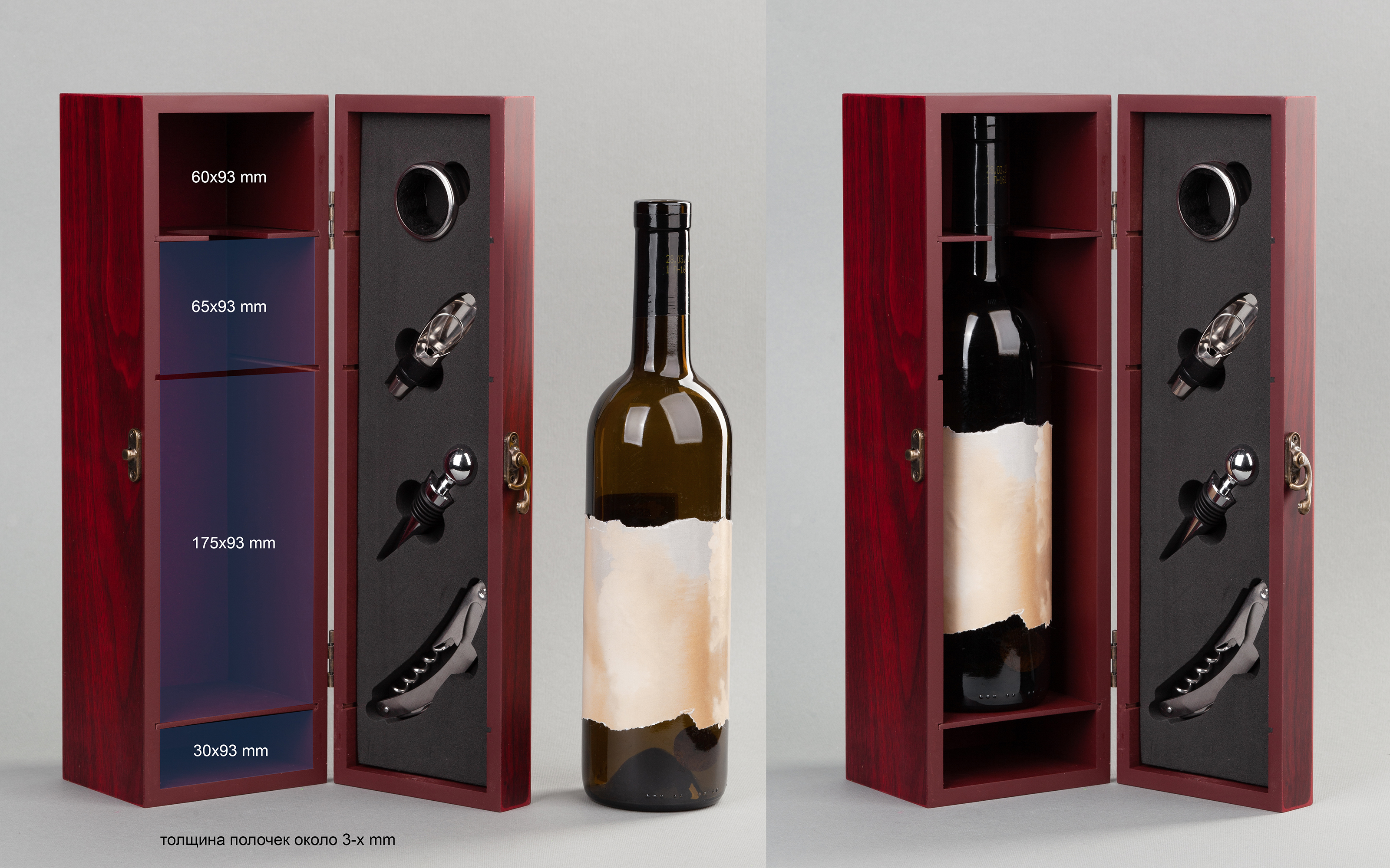 Готовый сет представлен в лаконичном деревянном футляре. Бутылка отличного вина в подарок достойна красивого оформления!